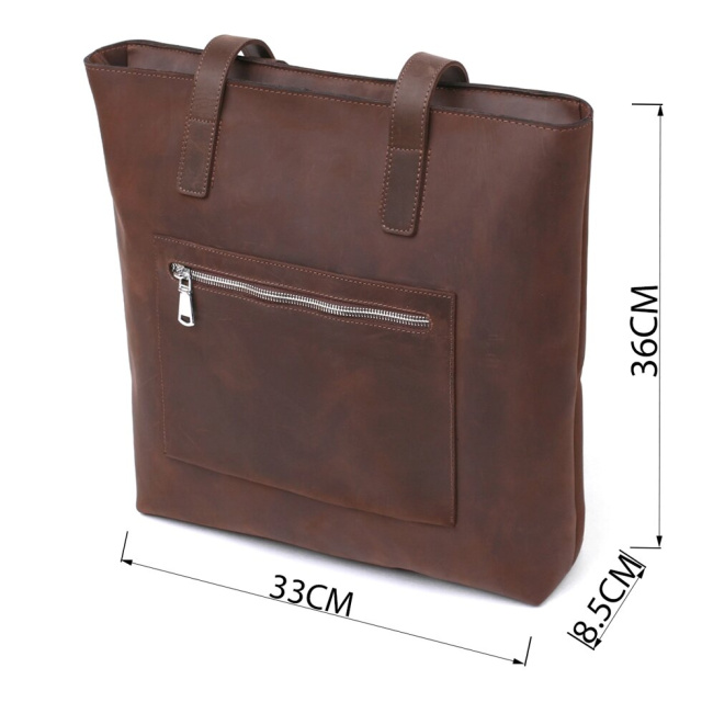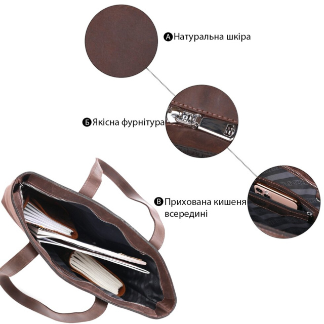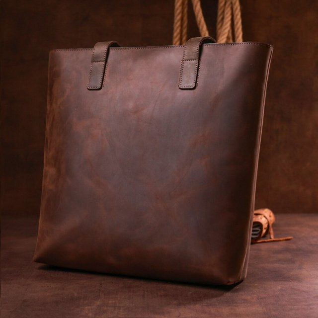 Стильна сумка-шоппер в акуратному лаконічному дизайні від українського виробника. Виконано модель із натуральної високоякісної шкіри з відмінними експлуатаційними характеристиками. Колір виробу - коричневий, фактура - гладка матова, що дуже приємно на дотик. Всередині одне просторе відділення з невеликою потайною кишенею на блискавці.