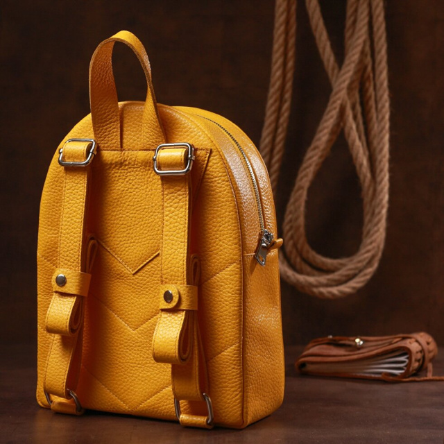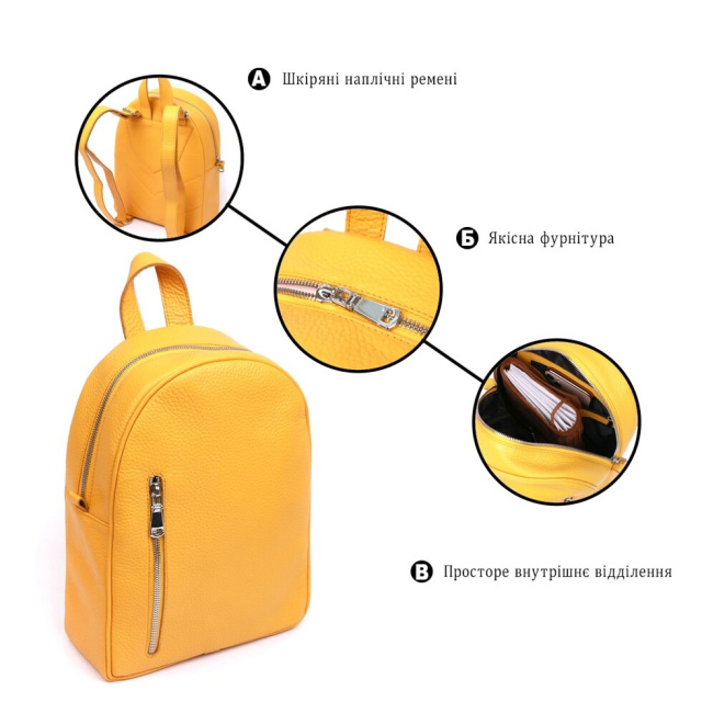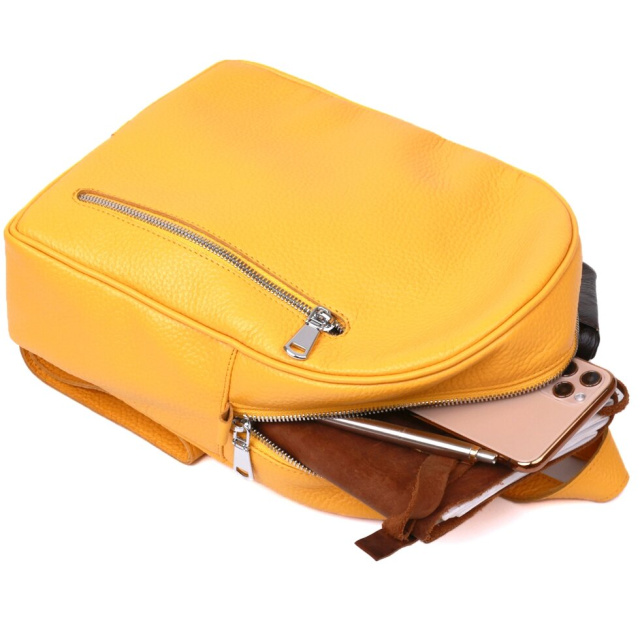 Дуже красивий та модний жіночий рюкзак у насиченому жовтому кольорі від українського виробника. Виконано виріб з натуральної шкіри з високою міцністю та стійкістю до зносу. Усередині є одне просторе відділення, кишеня на блискавці та кишеня для телефону. На зовнішній стороні є вертикальна кишеня на блискавці, що дуже зручно і практично.