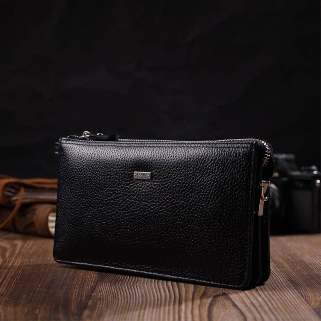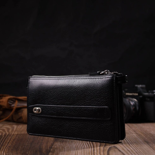 Стильний чоловічий клатч із натуральної м'якої шкіри, закривається виріб на блискавку, всередині можна без проблем розміщувати паперові банкноти, банківські картки та навіть смартфон. Аксесуар складається з двох відділень для купюр, двох прилеглих кишень, шести слотів для кредиток та монетниці на блискавці. Є також ручка для долоні на тильній стороні клатчу та знімний кистьовий ремінь. Продається клатч у красивій коробці від виробника. Якісний і надійний клатч - саме такий аксесуар повинен бути у кожної людини, що поважає себе.