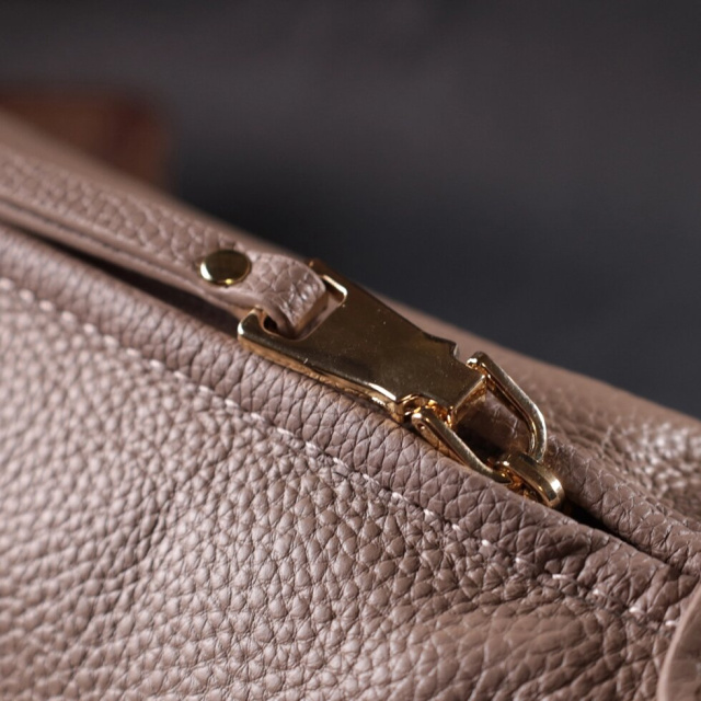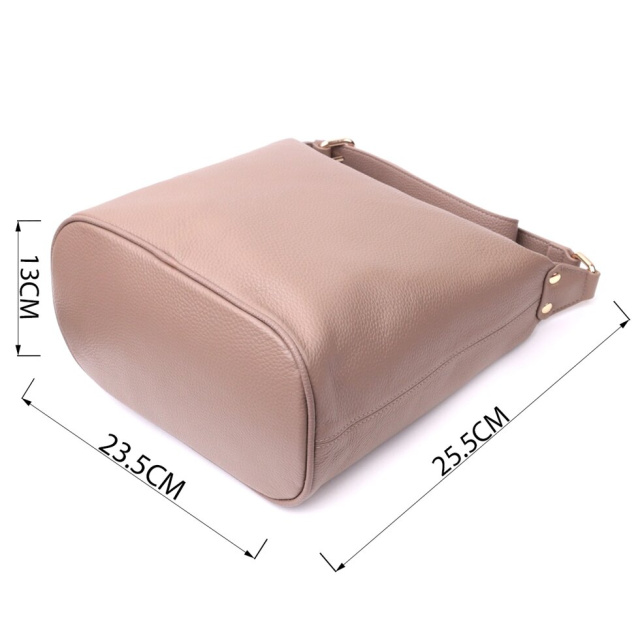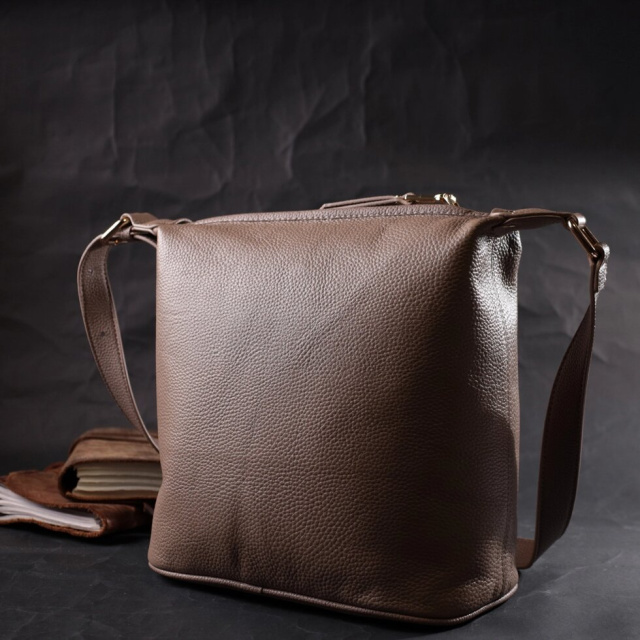 Жіноча стильна вертикальна сумка з твердим дном з натуральної м'якої шкіри, яка дуже добре показала себе в експлуатації. Аксесуар складається з основного відділення, потайної кишені на блискавці та кишені відкритого типу. Носити сумку можна на плечі та через плече, для цього є шкіряний незнімний регульований ремінь. У виробі використано якісну фурнітуру кольору жовтого золота. Чудовий варіант сумки на кожен день.