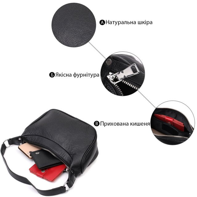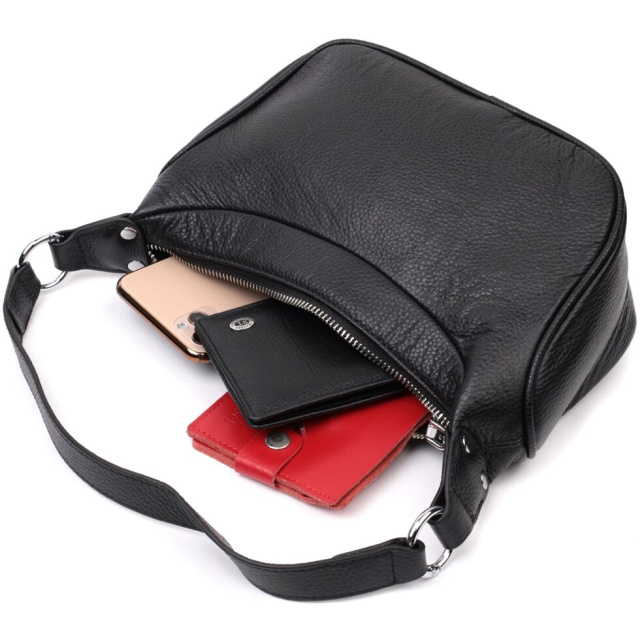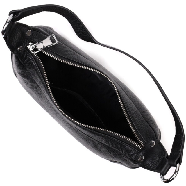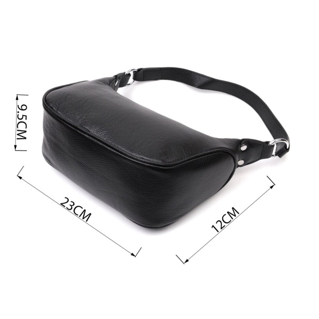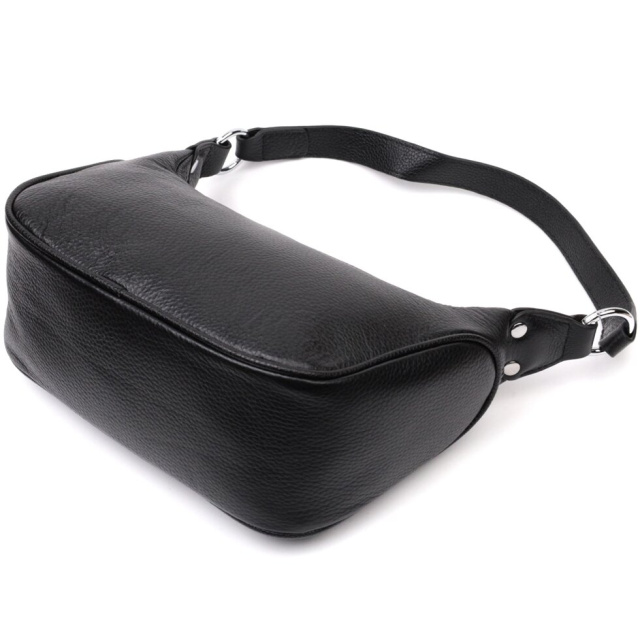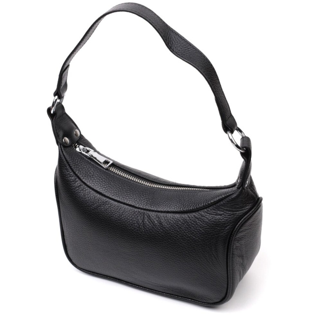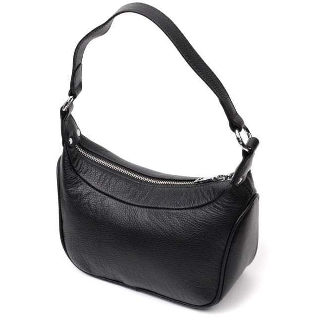 Жіноча сумка в класичному чорному кольорі з натуральної шкіри з високим показником якості та зносостійкості. Аксесуар складається з одного відділення з потайною кишенею на блискавці всередині. Носити сумку можна в руці, на плечі і через плече, для цього є шкіряний ремінь, що знімається. У виробі використано якісну фурнітуру кольору срібла. Відмінна сумка яка припаде до душі навіть найприскіпливішим модницям.