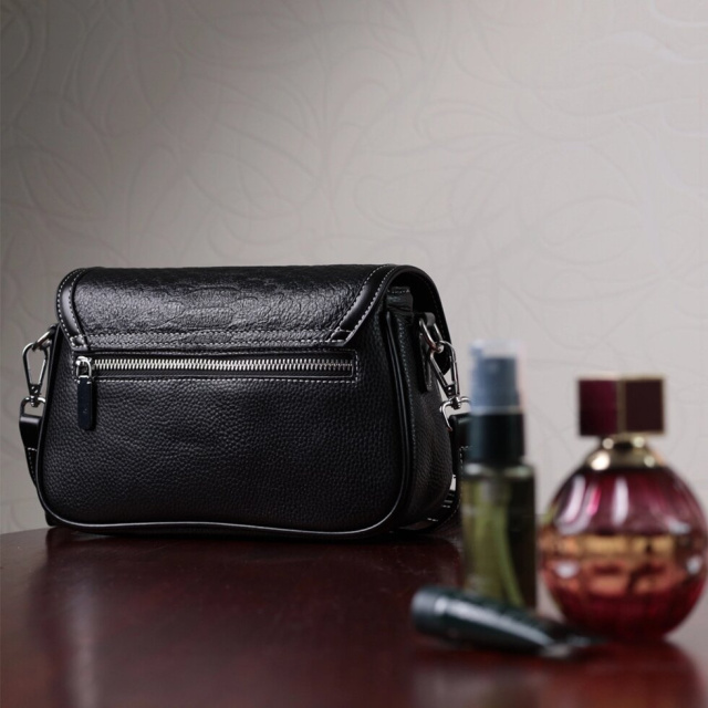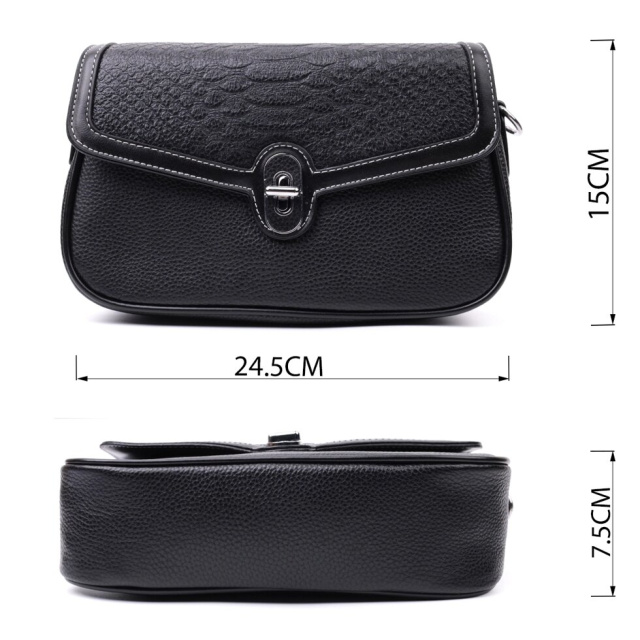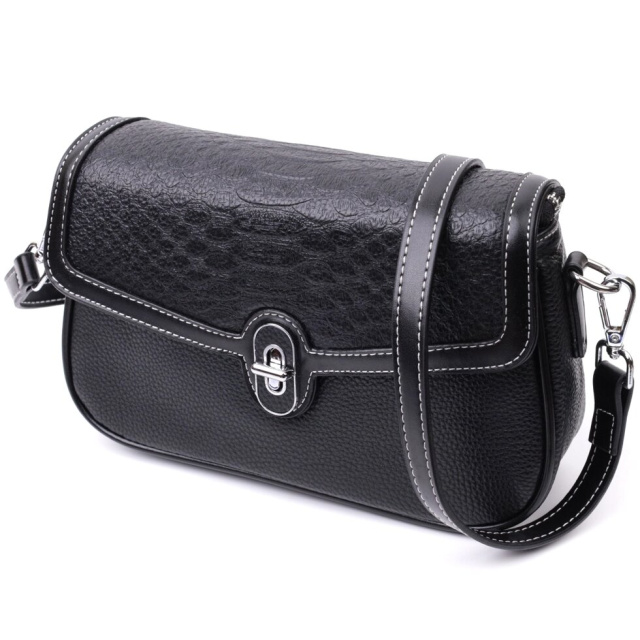 Зручна каркасна сумка жіноча з натуральної шкіри. У виробі використано шкіру чорного кольору з білим рядком по краю клапана. Притягує погляд у виробі фактурний клапан із тисненням під змію та витончена механічна клямка. Аксесуар складається з основного відділення, кишені-перегородки на блискавці, потайної кишені на блискавці та кишені відкритого типу, а також ще однієї кишені зовні, на тильній стороні. Носити сумку можна в руці, під рукою, на плечі і через плече, для цього є шкіряний ремінь, що знімається. В аксесуарі використано якісну фурнітуру кольору срібла. Універсальний варіант сумки на вечір, на щодня, а також буде відмінно поєднуватиметься з діловим стилем.