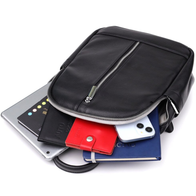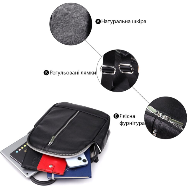 Для комфортного перенесення передбачена міцна шкіряна ручка, шкіряно-текстильні лямки, що регулюються, а також текстильний ремінець, що дозволяє носити рюкзак як сумку. Ця модель ідеально підійде для повсякденного використання, поєднуючи зручність та сучасний дизайн.