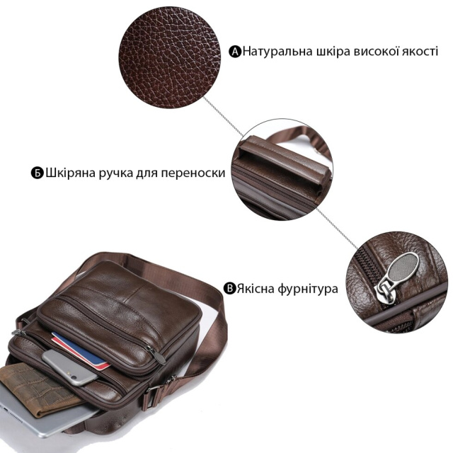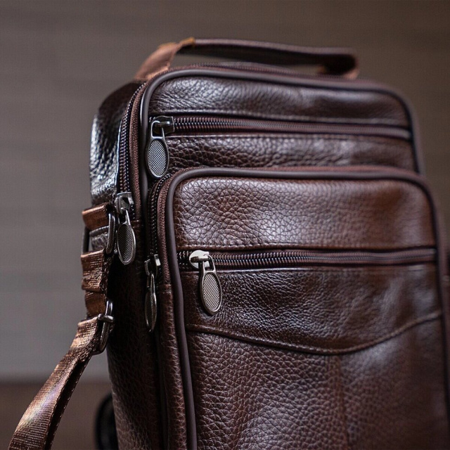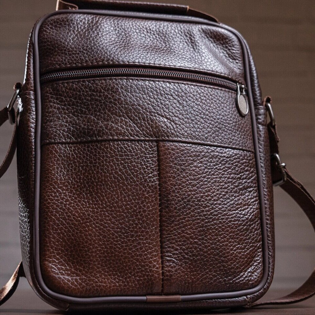 Якісна чоловіча сумка з натуральної шкіри. Виріб виконаний з зернистої шкіри коричневого кольору. Усередині аксесуара щільна текстильна підкладка коричневого кольору. Сумка буде вашим ідеальним варіантом на кожен день. Модель дуже зручна. Класичний дизайн ніколи не вийде з моди. Така сумка підійде під будь-які речі з вашого гардеробу. Модель доповнена якісною фурнітурою в дизайн виробу.