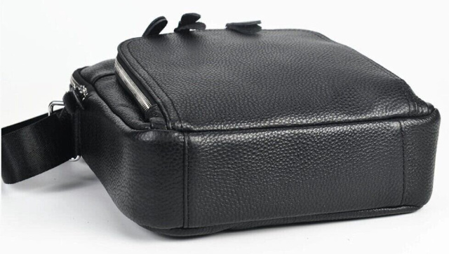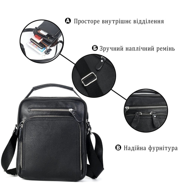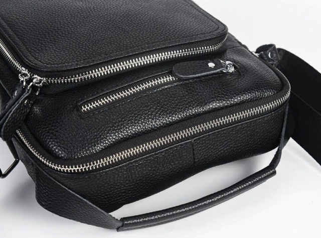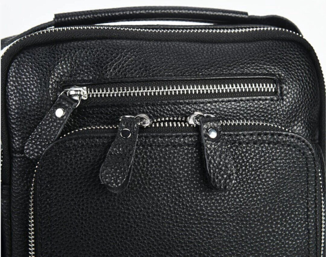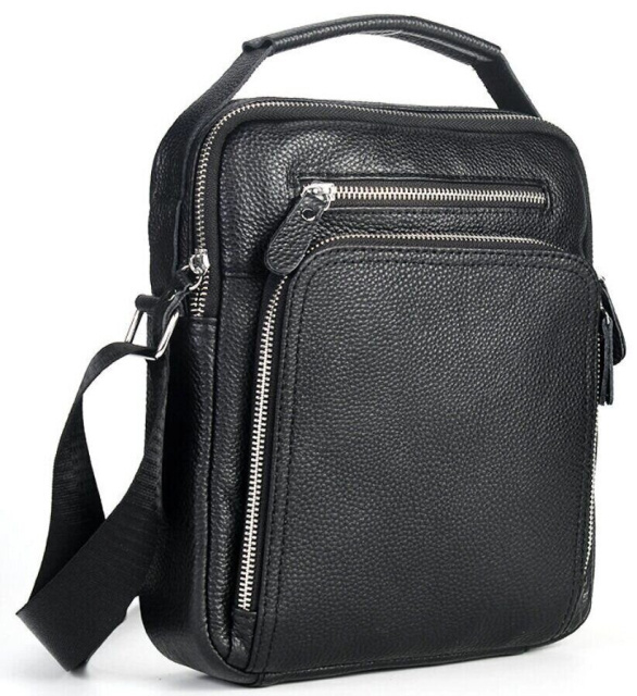 Надійна шкіряна сумка з натуральної зернистої шкіри, більш відомої як «флотар». Аксесуар обладнаний надійною металевою фурнітурою і міцним текстилем для внутрішньої підкладки. Із зовнішнього боку виробу розташовані дві кишені на блискавках (накладна і вбудована). Аксесуар складається з одного відділення на блискавці. Всередині - потайна кишеня на блискавці. Носиться сумка через плече з допомогою регульованого ременя або за допомогою шкіряної ручки в руках. Взявши сумку в руки, Вам більше не захочеться її відпускати, тому що якість відчувається відразу і чудовий сучасний дизайн припаде до душі більшості чоловіків.