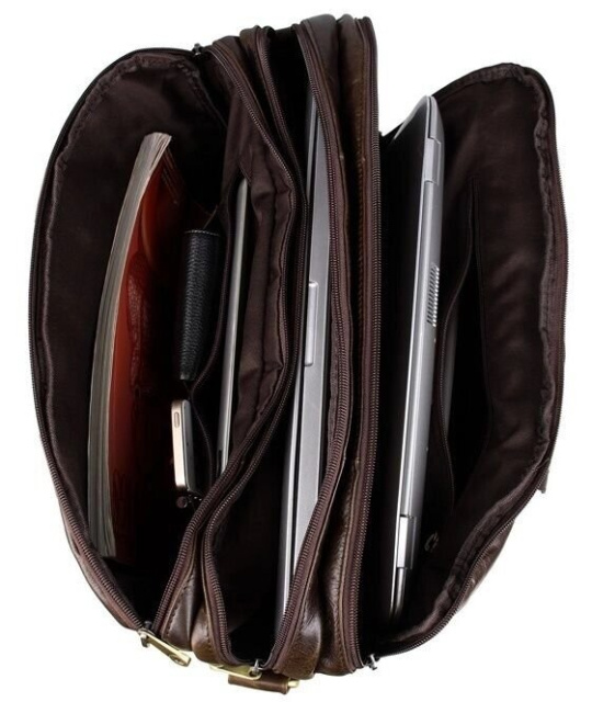Вмістка шкіряна чоловіча сумка коричневого кольору. Аксесуар відрізняється багатофункціональністю та високою якістю пошиття. Колір фурнітури: латунь. На лицевій стороні знаходиться відділення на блискавці, а також велика накладна кишеня на двох магнітних кнопках. На задній зовнішній стороні розташована велике відділення на блискавці. Підкладка виконана з міцного текстильного матеріалу темно-коричневого кольору.