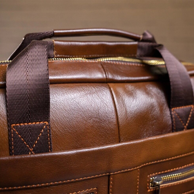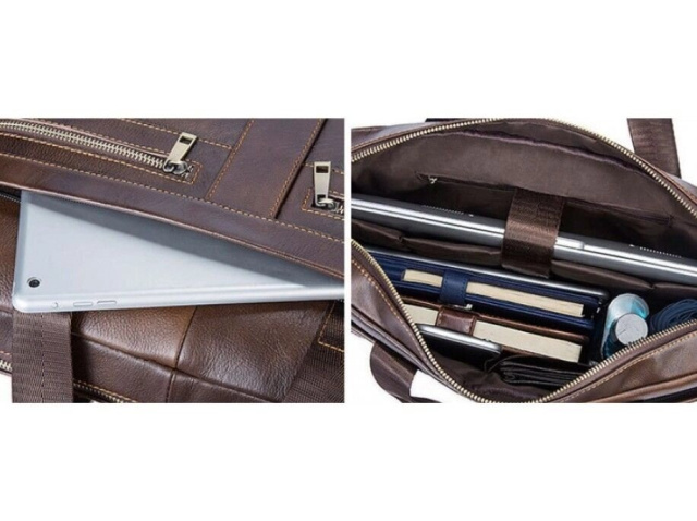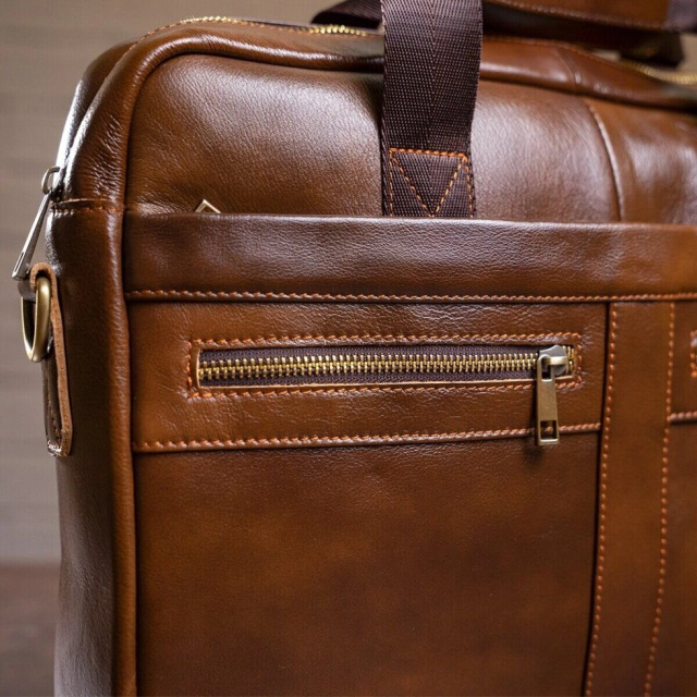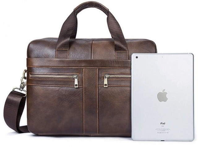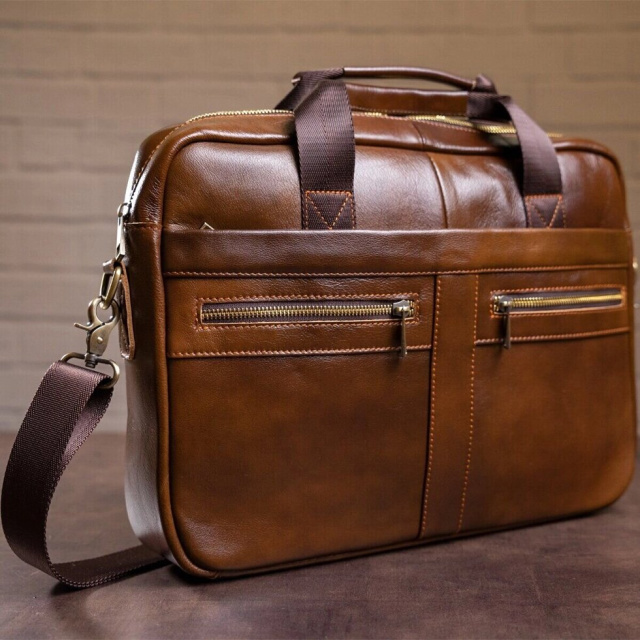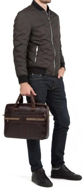 Коричнева багатофункціональна чоловіча сумка з відділенням для невеликого ноутбука 15 дюймі, а також документів формату А4. Аксесуар виконаний з натуральної зернистої шкіри коричневого кольору. На лицевій стороні даного вироби розташоване одне відділення і дві кишені на металевих блискавках. На задній зовнішній стороні знаходиться ще одне відділення на блискавці. Сумку можна переносити в руці за допомогою зручних шкіряних ручок, а також через плече (в комплекті є, регульований плечовий ремінь, який виконаний з текстильного матеріалу). Колір фурнітури: латунь.