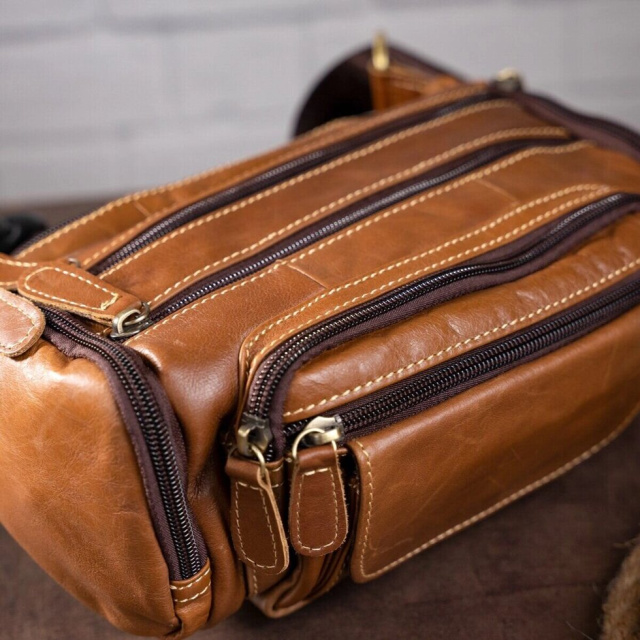 Об'ємна і містка бананка. Підійде як для чоловіків, так і для жінок. Ідеальний варіант, для тих хто носить із собою багато всякої дрібниці. Аксесуар доповнено фурнітурою золотистого кольору. Прошитий світлою ниткою по краях. З такою сумкою все найважливіше буде у вас завжди під рукою. А вкрасти сумку з пояса буде набагато складніше. Тому з такою бананка ви будете почувати себе безпечніше. Також, з нею зручно їздити в транспорті або брати її в далекі поїздки. Вам буде легко з такої сумки дістати документи або гроші при необхідності. Модель прошита рудою ниткою і доповнена фурнітурою сріблястого кольору. Буде добре виглядати в якості подарунка для близької людини.