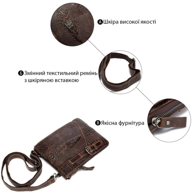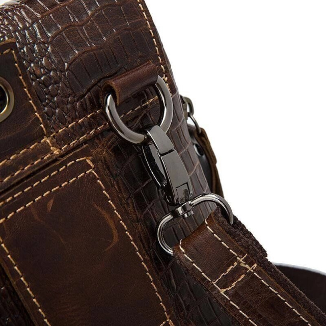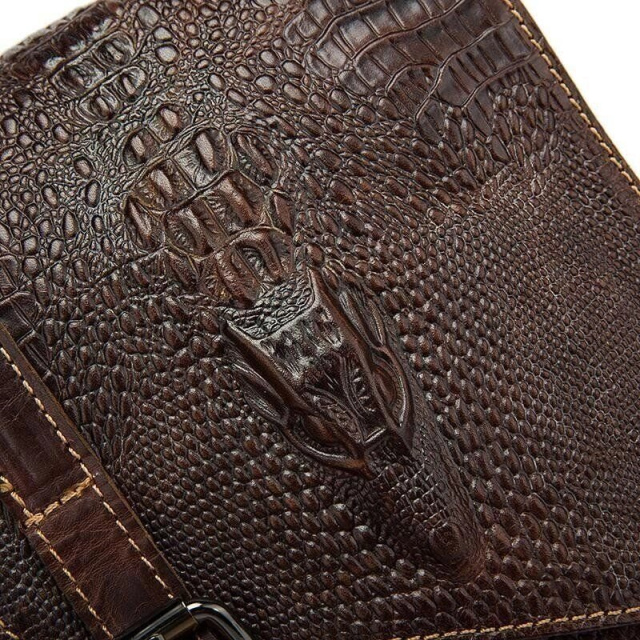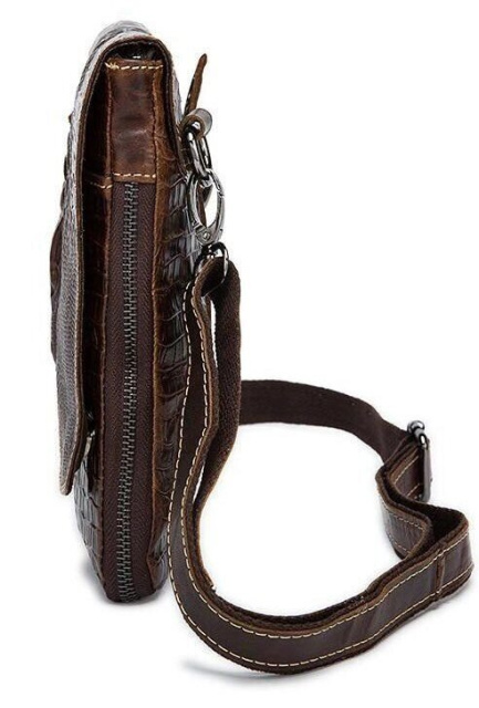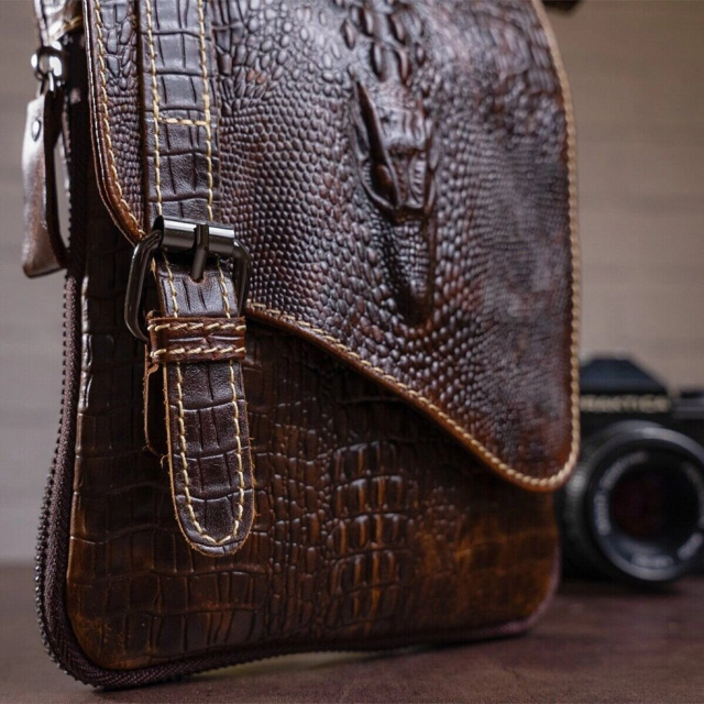 Тонкий чоловічий месенджер з натуральної шкіри. Особливістю моделі є те, що її наповненість (обсяг) можна регулювати за допомогою бічних блискавок. Завдяки даній особливості сумка стає ще більш універсальною. Її оригінальний дизайн з тисненням під шкіру крокодила однозначно виділить вас з натовпу і підкреслить відмінний смак. Аксесуар красиво блищить і переливається на сонці. Всередині - коричнева текстильна підкладка. Ідеально доповнює аксесуар якісна металева фурнітура кольору темного срібла. На лицьовій стороні аксесуара силует з тиснення голови крокодила. По краях месенджер прошитий світлою ниткою. На задній стороні моделі петелька на ремінець. Ви можете також носити сумку на поясі, підчепивши її на свій ремінь. Ми впевнені, що сумка не зможе залишити байдужим жодного чоловіка.
