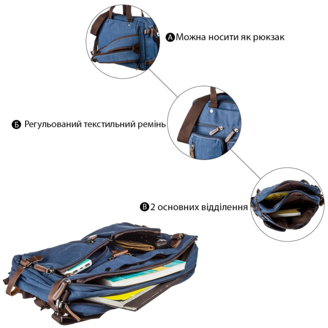 - два основних відділення, одне з ущільненою кишенею на липучці для ноутбука і кишенею на змійці, одне з двома накладними кишеньками;