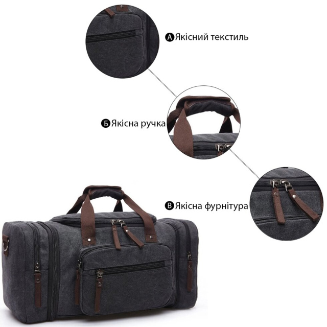 Якісна текстильна дорожня сумка. Відмінністю текстильної сумки є те, що вона важить менше ніж шкіряна. Сумка зовсім не вибаглива в догляді. При бажанні ви можете відрегулювати обсяг сумки за допомогою блискавки. Сумку можна носити в руках або на плечі. Виріб стане вашим незамінним помічником у подорожі. Виріб дуже місткий. Якщо ви відправляєтеся у відпустку всією сім'єю радимо взяти таку сумку вона витримає досить велике навантаження і не завдасть вам зайвого клопоту.