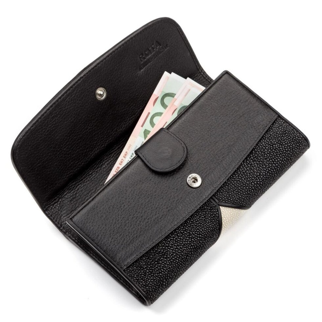 Оригінальний жіночий гаманець з натуральної шкіри морського ската, яка володіє фантастичною фактурою і красою, а також є дуже стійкою до зносу, проколів, порізів, до розривів і навіть до вогню. Весь простір шкіри покрито сотнями дрібних горбків, різного розміру, які грають на світлі, як невеликі намистинки. Аксесуар декорований, контрастними вставками з білої шкіри, що надають виробу оригінальності і яскравості. Дуже престижний аксесуар, який підійде жінці, яка цінує зручність і якість.
