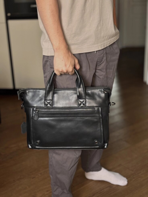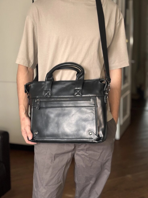 Класична горизонтальна сумка чорного кольору. Сумку можна носити як з допомогою плечового ременя так і в руках.