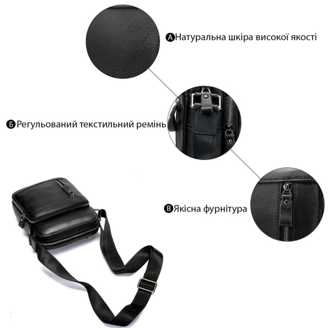 Компактна сумка для чоловіків на кожен день. По краях аксесуар прошитий чорною ниткою. Усередині сумки міцна текстильна підкладка чорного кольору. Особливістю такої шкіри є, те що на ній не видно подряпин і зносу. Ви будете приємно здивовані, адже сумка довго буде носитися. Може бути прекрасним варіантом для подарунка кожному чоловіку.