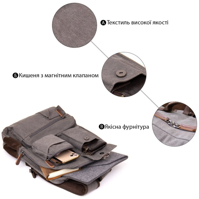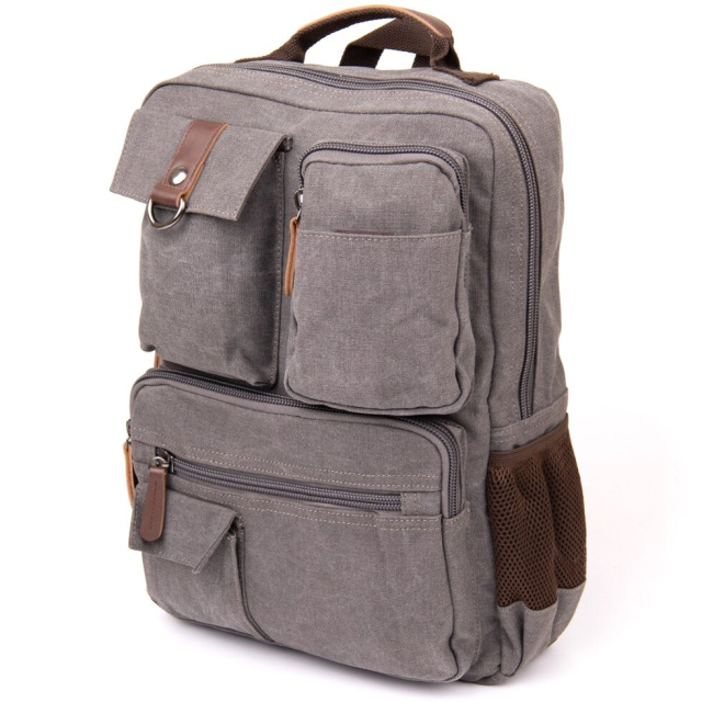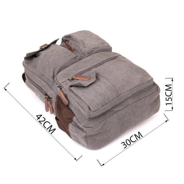 Великий рюкзак для ноутбука і подорожей. Виріб має досить кишеньок як на лицьовій стороні так і всередині. У поєднанні з якісною фурнітурою рюкзак прослужить вам далеко не один рік. Виріб дуже практичного кольору на якому практично не видно бруду. Усередині тканинна підкладка. Рюкзак стане відмінним варіантом як для ноутбука так і в подорож. Виріб має відносно легку вагу. Текстильний рюкзак - найкращий варіант у співвідношенні ціни і якості.