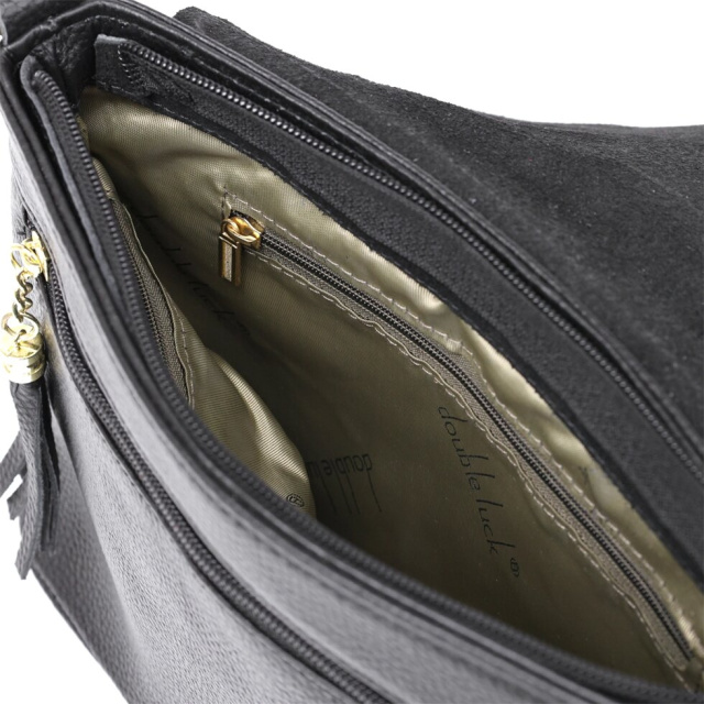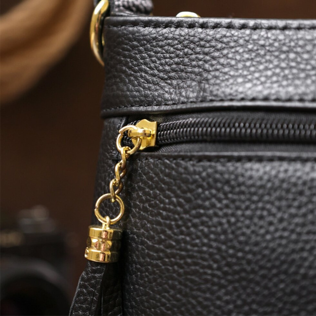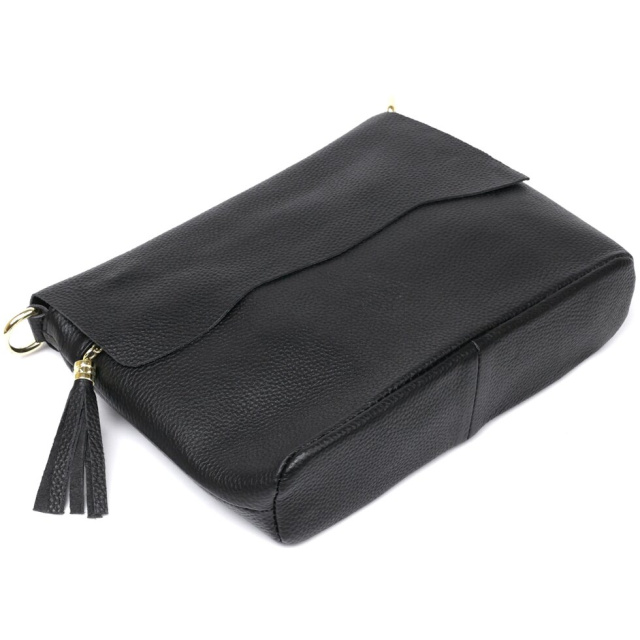 Красива сумка жіноча компактного розміру з натуральної високоміцної шкіри з відмінними експлуатаційними характеристиками. Має класичний чорний колір та зернисту фактуру. Фурнітура виконана у кольорі під золото. Внутрішнє наповнення представлене у вигляді місткого відділення та кількох кишень.