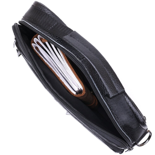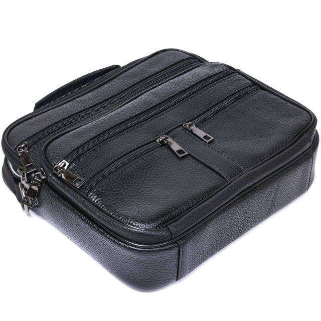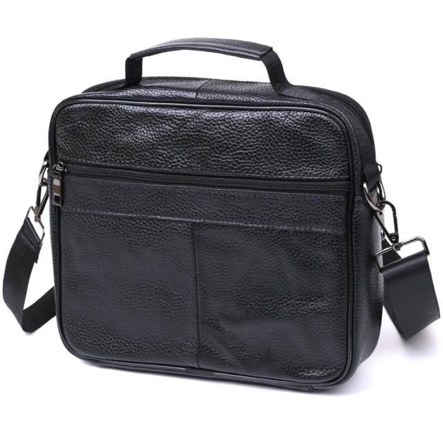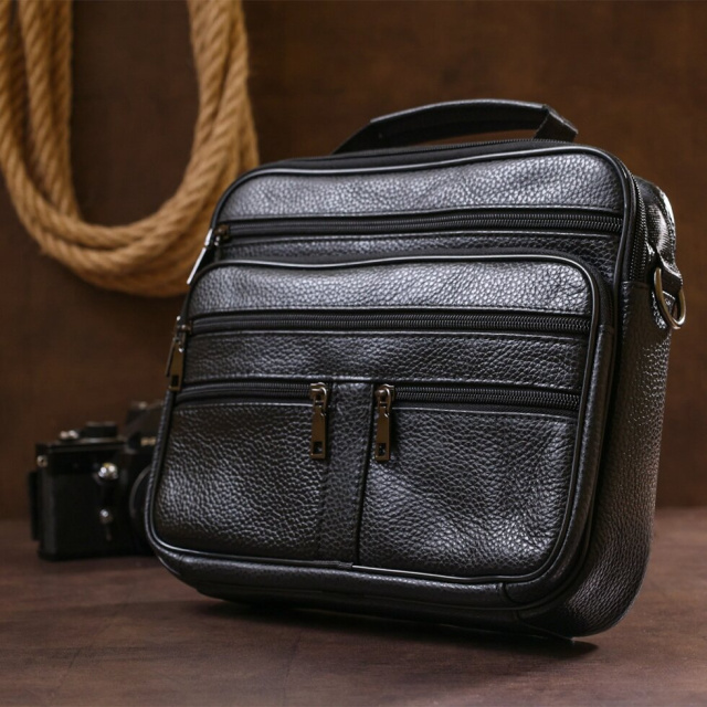 Чудова чоловіча сумка з натуральної шкіри з підвищеною зносостійкістю. Внутрішнє наповнення представлене у вигляді місткого відділення та безлічі кишень різного розміру, тому весь вміст буде добре впорядкований. Дана модель виконана в чорному кольорі і має зернисту приємну на дотик фактуру.