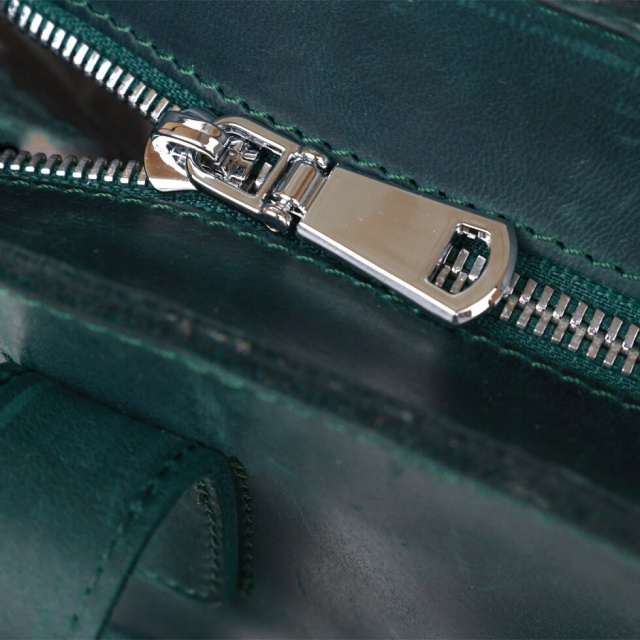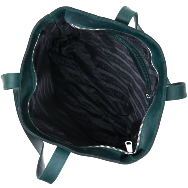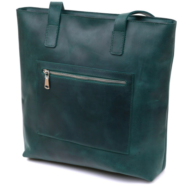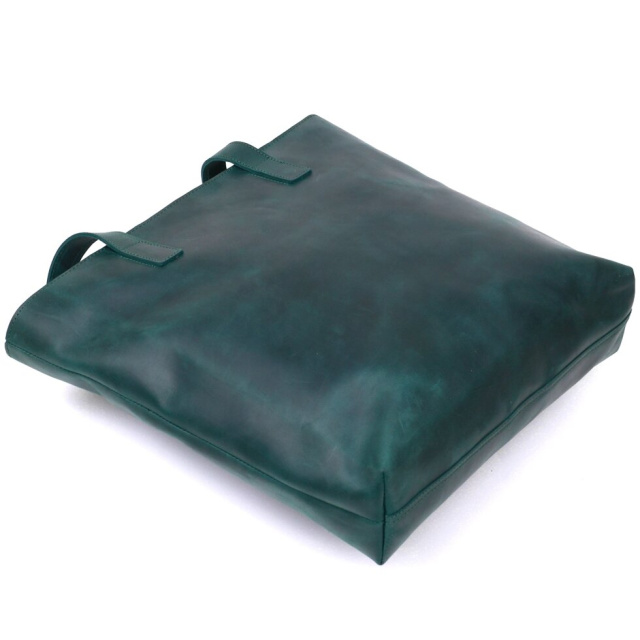 Чудова містка сумка для шопінгу від українського виробника в красивому і сучасному дизайні. Виконана вона з натуральної шкіри високого класу та відмінною стійкістю до зносу. Колір виробу – зелений, фактура – гладка та матова, що виглядає дуже стильно та модно. Основне відділення закривається на блискавку, воно досить містке та зручне у використанні.