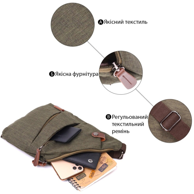 Зручна та багатофункціональна чоловіча сумка через плече для повсякденного використання. Має простий та лаконічний дизайн та функціонал, все продумано для того, щоб усі особисті речі були в безпеці та під рукою. Ремінь зроблений також із високоміцного текстилю і може регулюватися по довжині, а також легко чіпляється на праву чи ліву сторону за Вашими уподобаннями.