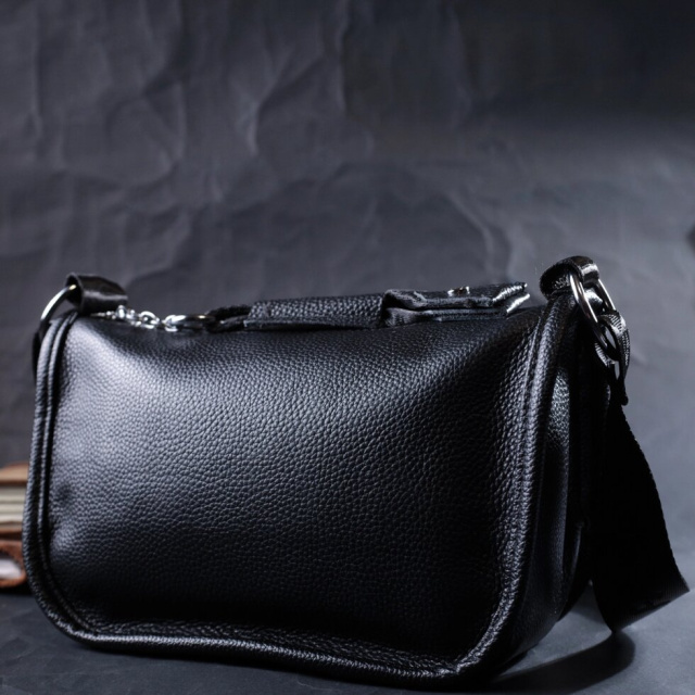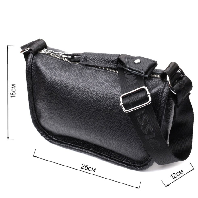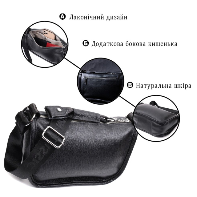 Жіноча напівкругла сумка з натуральної шкіри з високим показником якості та зносостійкості. Аксесуар складається з основного відділення, що закривається на блискавку, всередині якого знаходиться потайна кишеня на блискавці та кишеня відкритого типу, а також кишеня на блискавці на тильній стороні зовні. Носити сумку можна на плечі, для цього є незнімний текстильний ремінь, що регулюється. У виробі використано якісну фурнітуру срібного кольору.