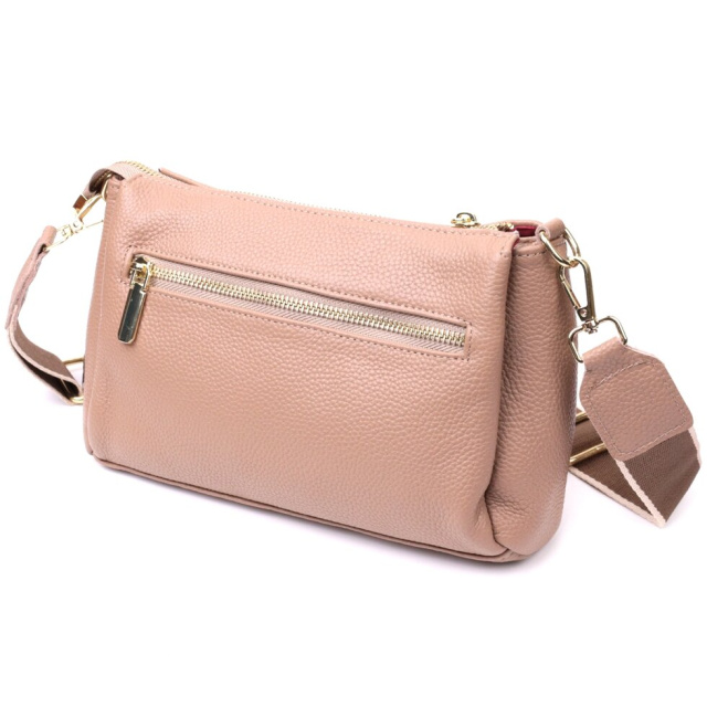 Цікава сумка світло-бежевого кольору з легкою рожевинкою з натуральної шкіри з високим показником якості та зносостійкості Аксесуар складається з трьох основних відділень, потайної кишені на блискавці, кишені відкритого типу та кишені на блискавці зовні. Носити сумку можна під рукою, на плечі та через плече, для цього є текстильний ремінь, що знімається. У виробі використано якісну фурнітуру кольору жовтого золота. Універсальний варіант сумки як на вечір так і як сумочка на кожен день.