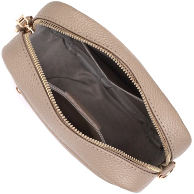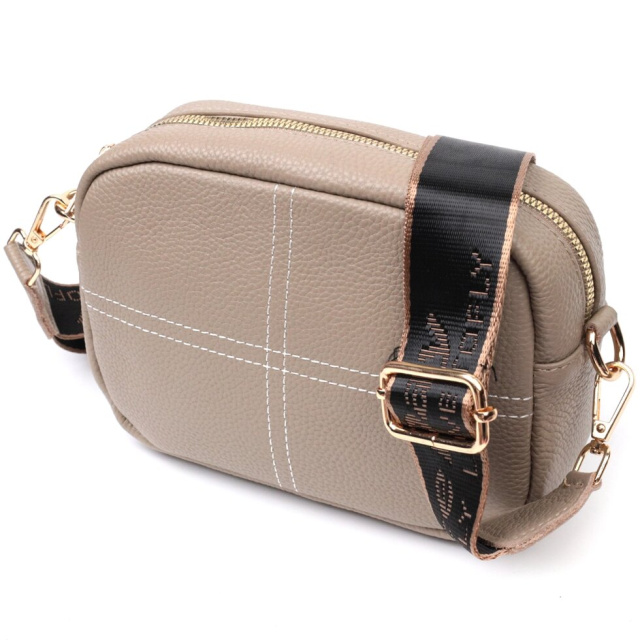 Прямокутна сумка на плече з натуральної шкіри з високим показником якості та зносостійкості. На лицьовій стороні сумки присутній декоративний подвійний хрестоподібний рядок, що надає виробу своєї родзинки та неповторного стилю. Аксесуар складається з основного відділення, що закривається на блискавку, всередині якого знаходиться потайна кишеня на блискавці та кишеня відкритого типу, а також зовнішня кишеня на блискавці на тильній стороні. Носити сумку можна на плечі і через плече, для цього є текстильний ремінь, що знімається. У виробі використано якісну фурнітуру кольору жовтого золота. Універсальний варіант сумки як на вечір, так і як сумочка на кожен день.