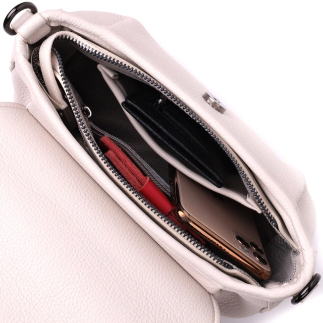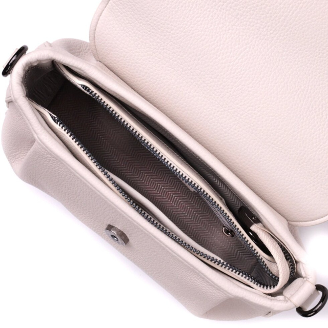 Стильна сумка з фактурним клапаном з натуральної шкіри флотар, яка невибаглива у догляді та довго носиться. Аксесуар складається з трьох основних відділень, двох відкритого типу та одного посередині, що закривається на блискавку та має потайну кишеню на блискавці, кишеню відкритого типу та кишені на блискавці зовні. Носити сумку можна під рукою, на плечі і через плече, для цього є два ремені, що знімаються, текстильний і шкіряний. У виробі використано якісну фурнітуру кольору темного срібла. Універсальний варіант сумки як на вечір так і як сумочка на кожен день.
