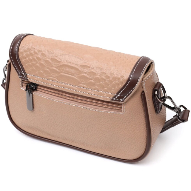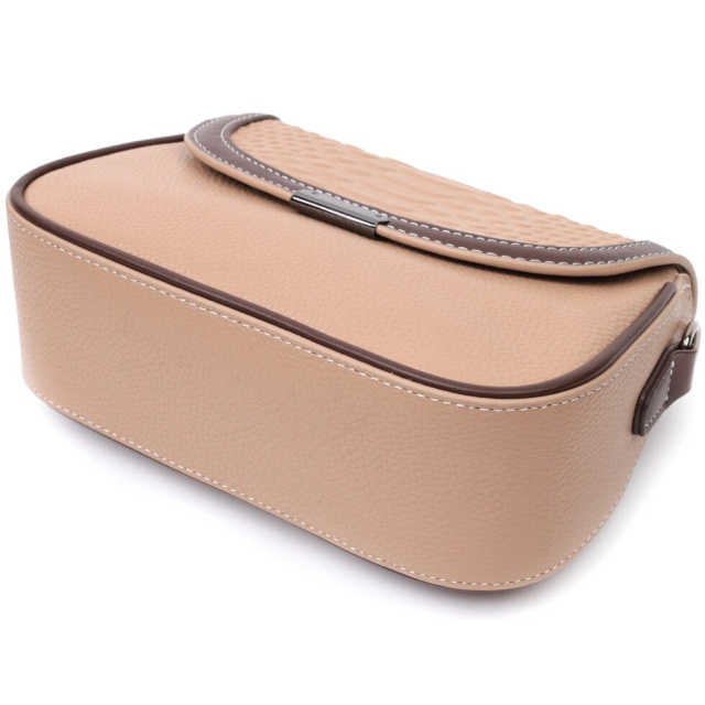 Стильна каркасна жіноча сумка з натуральної шкіри флотар, яка невибаглива у догляді та довго носиться. У виробі використана шкіра бежевого та коричневого кольору. Аксесуар складається з двох основних відділень, кишені-перегородки, потайної кишені на блискавці та кишені відкритого типу. Носити сумку можна в руці, під рукою, на плечі і через плече, для цього є шкіряний ремінь, що знімається. В аксесуарі використано якісну фурнітуру кольору срібла. Універсальний варіант сумки на вечір, щодня, а також відмінно поєднуватиметься з діловим стилем.