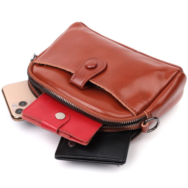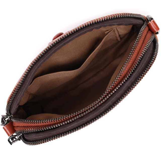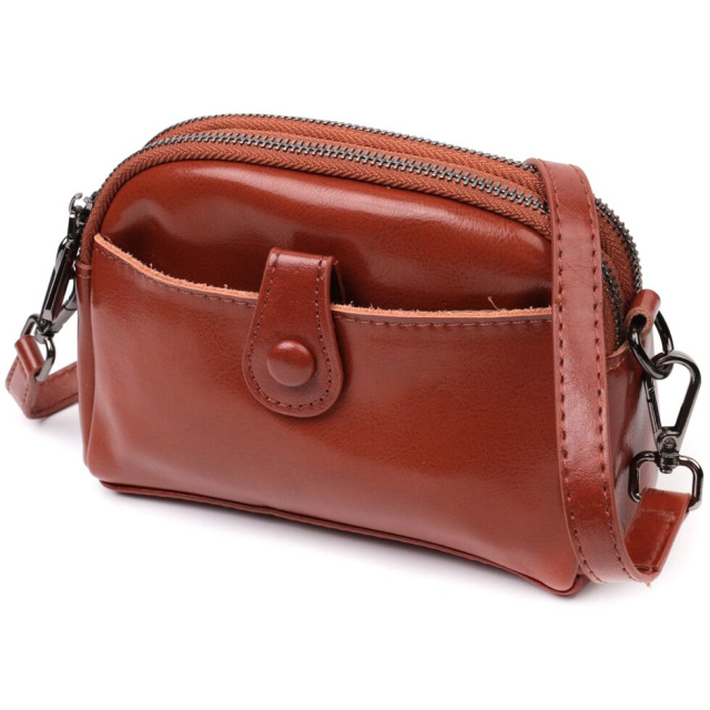 Маленька жіноча сумка на два автономні відділення з натуральної глянсової шкіри, яка невибаглива у догляді та довго носиться. Аксесуар складається з двох основних відділень, потайної кишені на блискавці, кишені відкритого типу, кишені на лицьовій стороні, що закривається хлястиком на магніт та кишені на блискавці зовні, на тильній стороні. Носити сумку можна в руках, на плечі і через плече, для цього є шкіряний ремінь, що знімається. У виробі використано якісну фурнітуру кольору темного срібла. Універсальний варіант сумки як на вечір так і як сумочка на кожен день.