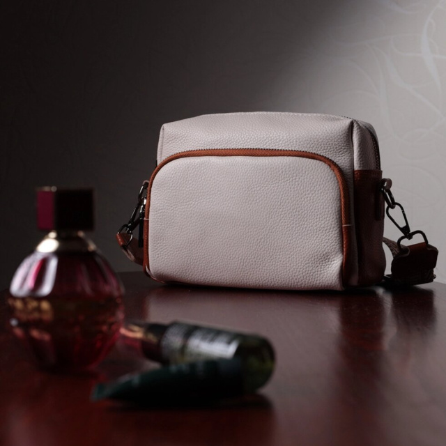 Відмінна жіноча сумка на кожен день із натуральної шкіри. У виробі використана шкіра білого та коричневого кольору. Притягує погляд у виробі текстильний ремінь із гарним малюнком. Аксесуар складається з основного відділення, потайної кишені на блискавці та кишені відкритого типу, а також двох кишень зовні на лицьовій та тильній стороні. Носити сумку можна в руці, під рукою, на плечі і через плече, для цього є текстильний ремінь, що знімається. В аксесуарі використано якісну фурнітуру кольору темного срібла. Відмінний варіант для подарунка близьким та дорогим дівчатам та жінкам.