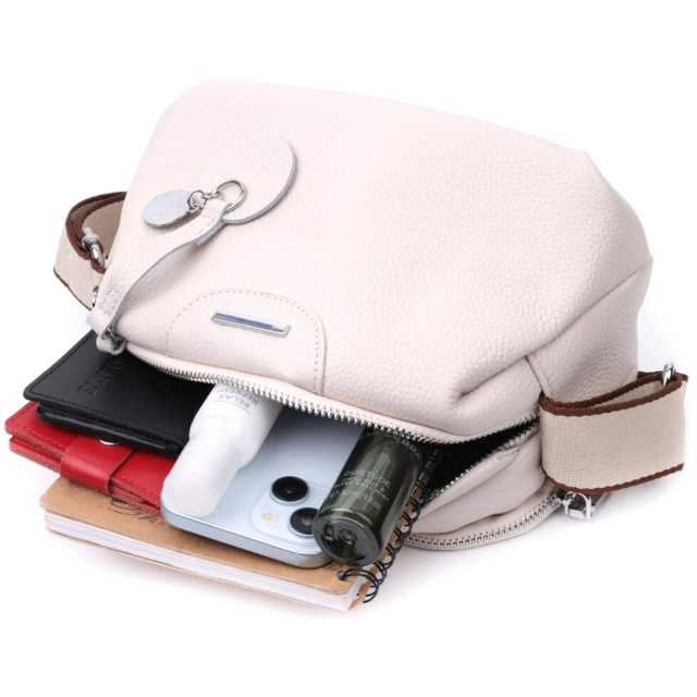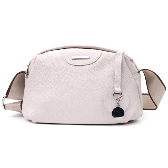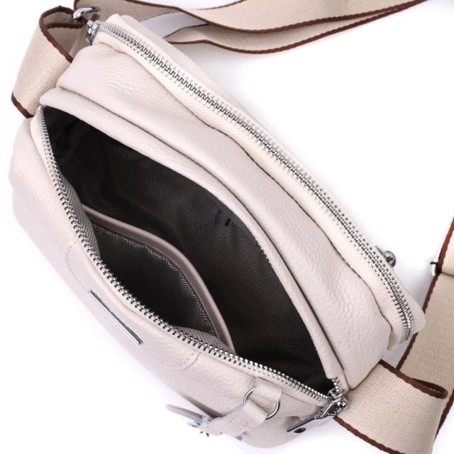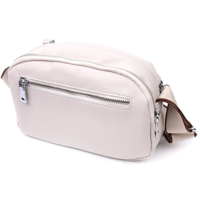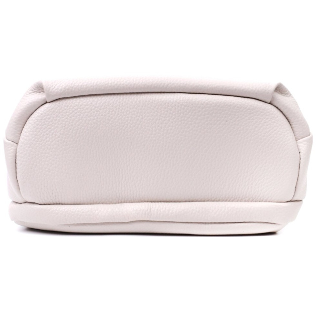 Елегантна сумка для жінок із натуральної шкіри флотар, яка має зернисту фактуру. У виробі використано шкіру білого кольору. Аксесуар складається з двох відділень, які закриваються на блискавки, потайної кишені на блискавці та кишені відкритого типу, а також кишені зовні на тильній стороні. Виріб має тверде дно, що дозволяє зберігати форму. Носити сумку можна в руці, під рукою, на плечі і через плече, для цього є текстильний ремінь, що не знімається. В аксесуарі використано якісну фурнітуру кольору срібла. Відмінний варіант для подарунка близьким та дорогим дівчатам та жінкам.