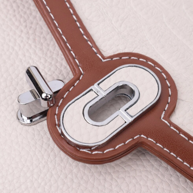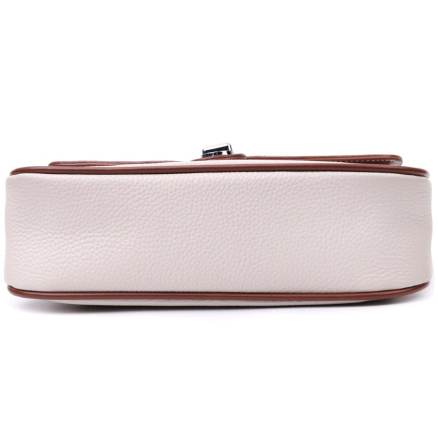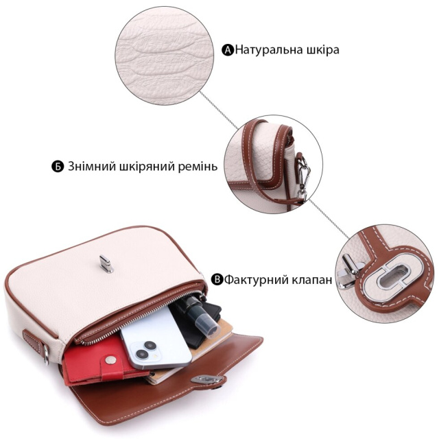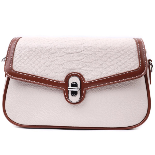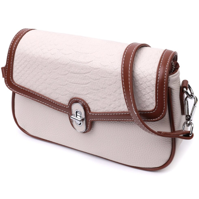 Красива каркасна сумка жіноча з натуральної шкіри. У виробі використана шкіра білого та коричневого кольору. Притягує погляд у виробі фактурний клапан із тисненням під змію та витончена механічна клямка. Аксесуар складається з основного відділення, кишені-перегородки на блискавці, потайної кишені на блискавці та кишені відкритого типу, а також ще однієї кишені зовні, на тильній стороні. Носити сумку можна в руці, під рукою, на плечі і через плече, для цього є шкіряний ремінь, що знімається. В аксесуарі використано якісну фурнітуру кольору срібла. Універсальний варіант сумки на вечір, на щодня, а також буде відмінно поєднуватиметься з діловим стилем.