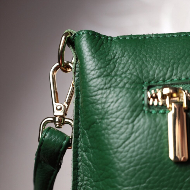 Практична жіноча функціональна сумка-клатч із натуральної шкіри. Аксесуар складається з основного відділення, що закривається на блискавку, кишені-перегородки на блискавці всередині та кишені на блискавці на тильній стороні, зовні. Носити сумку можна на плечі і через плече, також можна носити як клатч під рукою і на кисті, для цього є довгий ремінець, що знімається, а також знімний кистьовий ремінь.