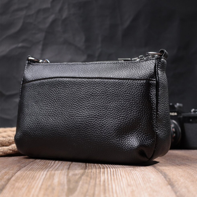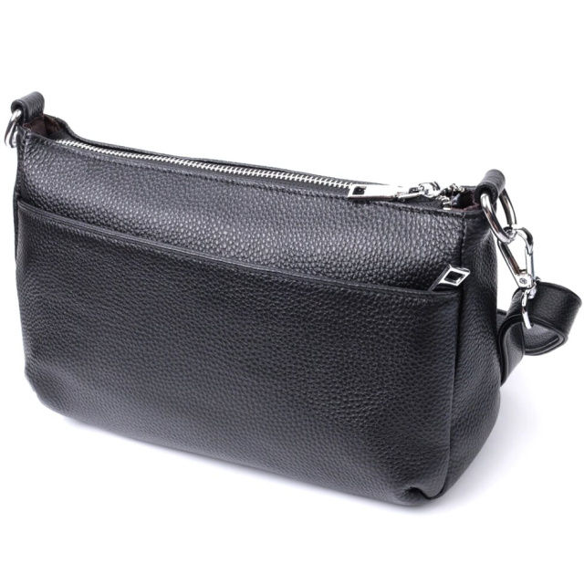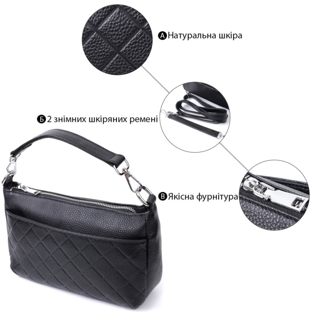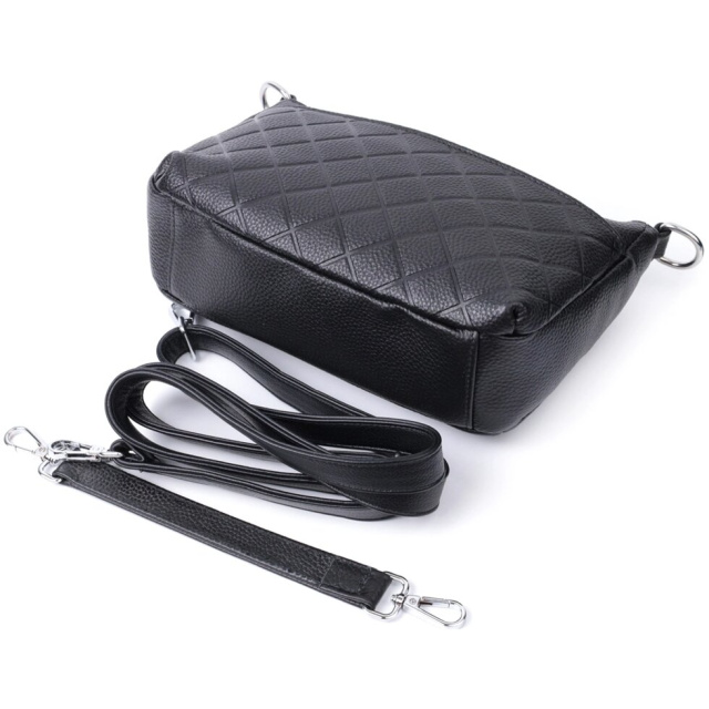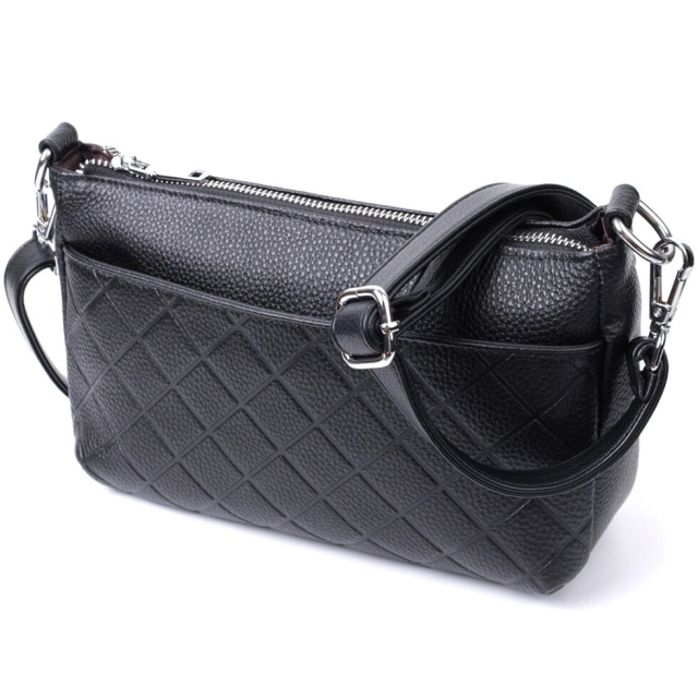 Прямокутна сумка для жінок у класичному чорному кольорі з натуральної шкіри високої якості. Виріб дуже зручний, можна носити на плечі та в руках. На лицьовій стороні сумка декорована ромбоподібним тисненням, що надає особливого шарму виробу. Модель доповнена фурнітурою кольору срібла. Аксесуар має три відділення, і дві кишеньки - одна на блискавці та одна відкритого типу, у відділенні, що посередині. Ідеальний варіант сумки на кожен день.