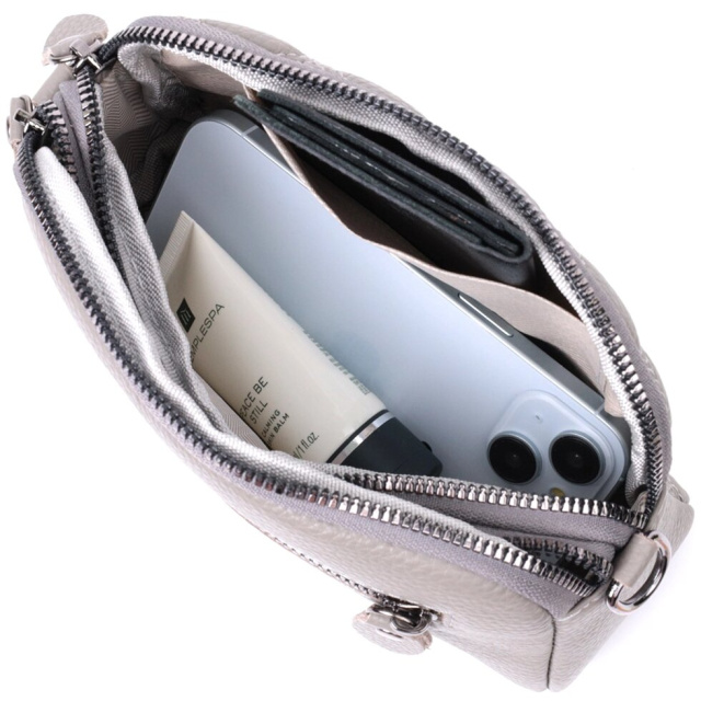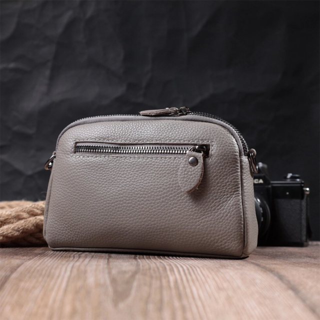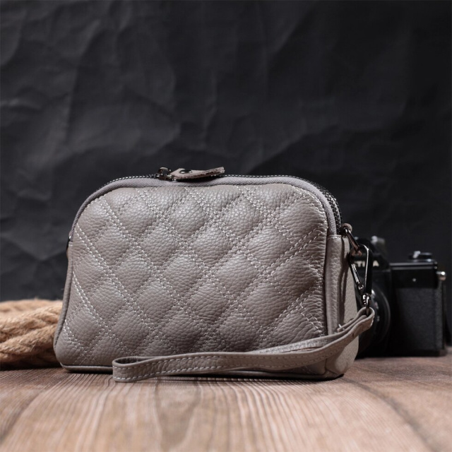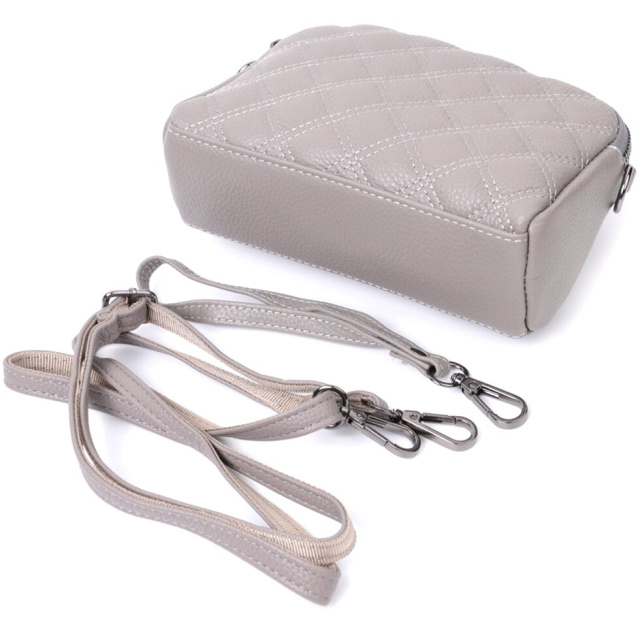Зручна сумка для жінок із натуральної шкіри високої якості. Виріб дуже зручний, можна носити на плечі, руках і на кисті, для цього є шкіряний ремінець, що знімається і знімний кистьовий ремінь. На лицьовій стороні сумка прошита ромбами, що надає особливого шарму виробу. Модель доповнена фурнітурою кольору темного срібла. Аксесуар має два відділення, що закриваються на блискавки, дві кишеньки - одна на блискавці та одна відкритого типу всередині та одна кишеня на блискавці на тильній стороні. Якщо Вам потрібен варіант повсякденної сумки, яка відмінно підійде як вечірня, то ця модель ідеальний варіант.