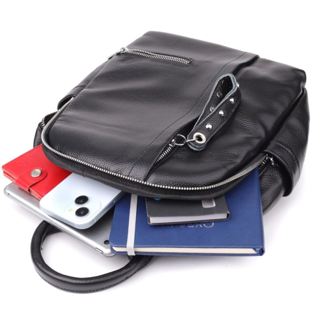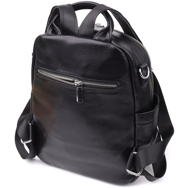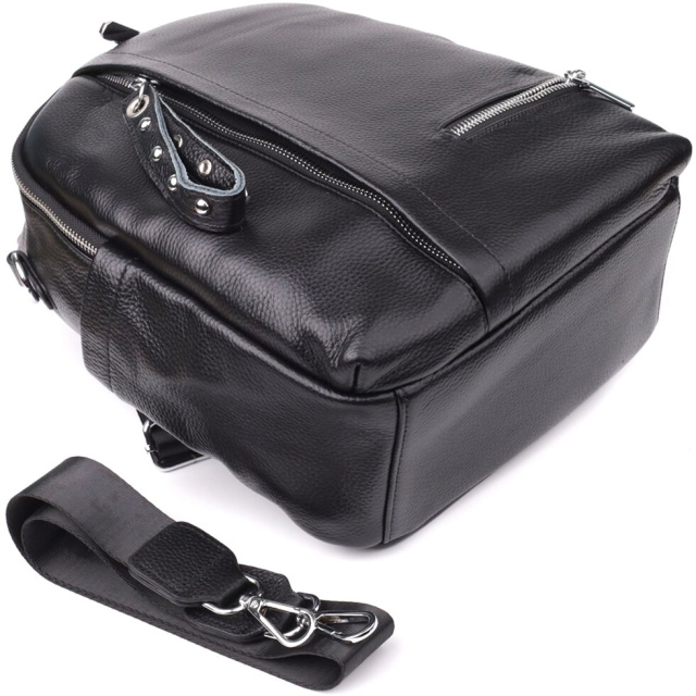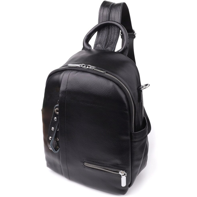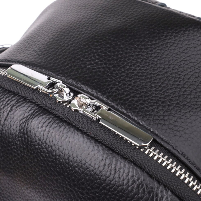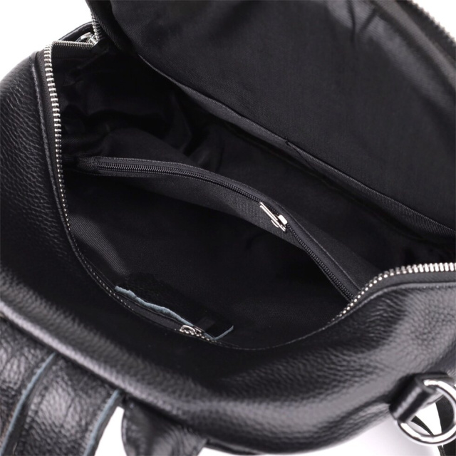 Жіночий шкіряний рюкзак поєднує елегантність та функціональність. Основне відділення на блискавці забезпечує надійне зберігання речей, всередині розташовані дві кишені на блискавках і одна відкритого типу для зручної організації дрібниць. На лицьовій стороні рюкзака знаходяться накладна і вбудована кишені, що закриваються на блискавку, а також дві бічні кишені для додаткових аксесуарів.