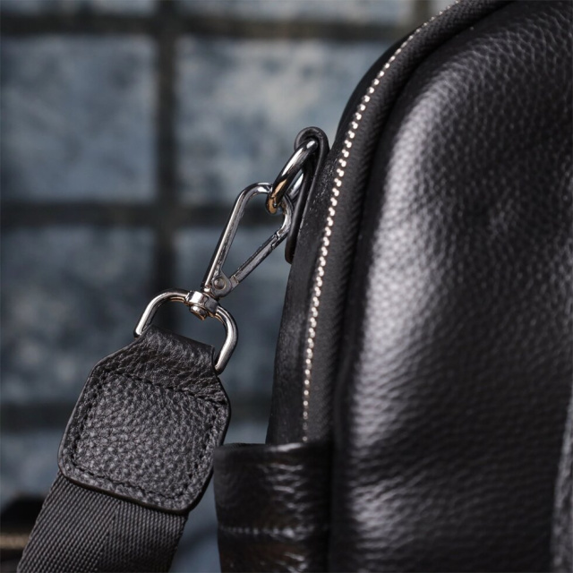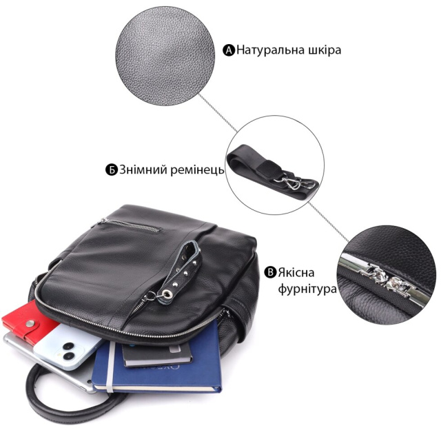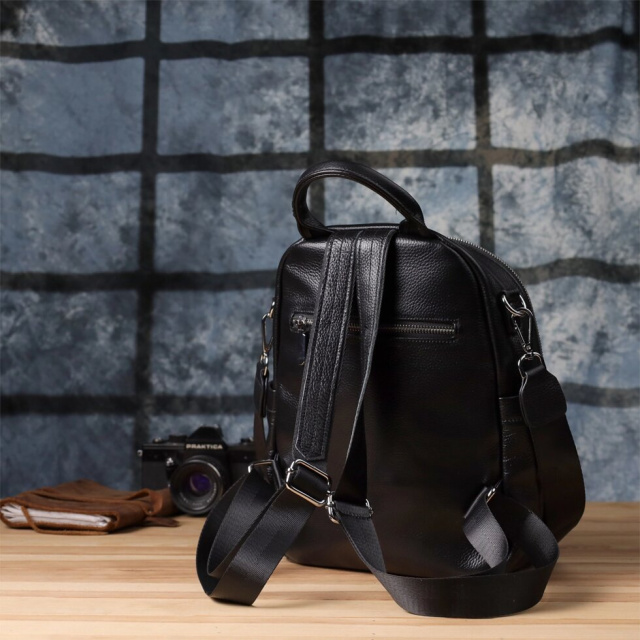 На тильній стороні розташована ще одна кишеня на блискавці, що забезпечує швидкий доступ до необхідних предметів. Для комфортного перенесення передбачена міцна шкіряна ручка і текстильні лямки, що регулюються. Додатково рюкзак оснащений текстильним ремінцем, що дозволяє носити його як сумку, що робить модель універсальною та зручною для повсякденного використання.