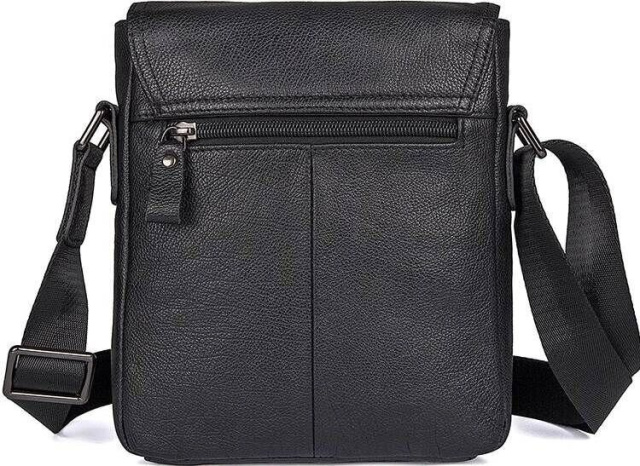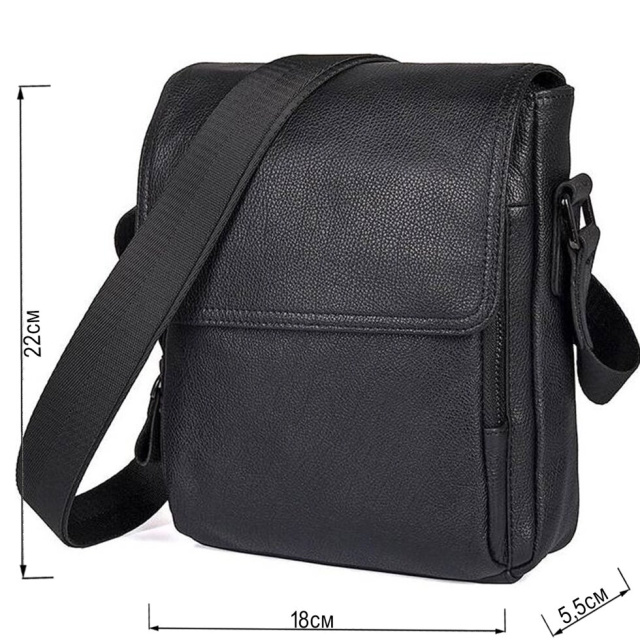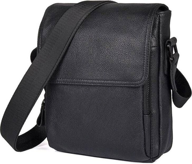Компактна чоловіча сумка чорного кольору, з натуральної зернистої шкіри. Колір фурнітури: темне срібло. Аксесуар невеликий, але при цьому досить вмісткий і функціональний.
