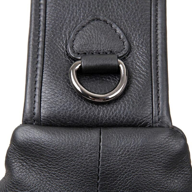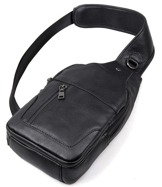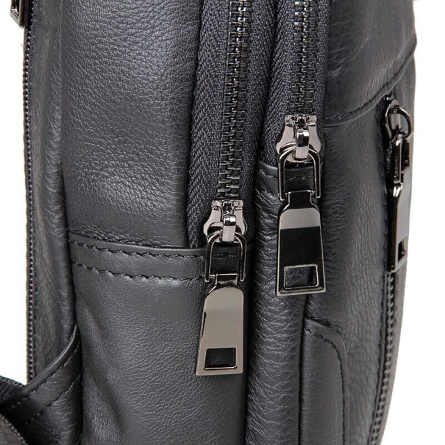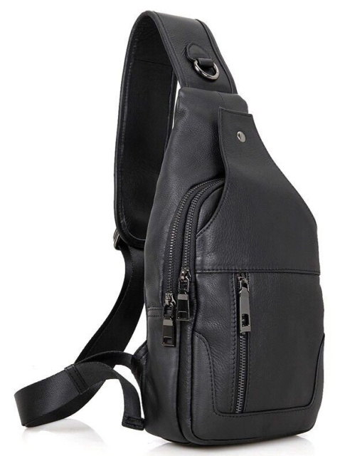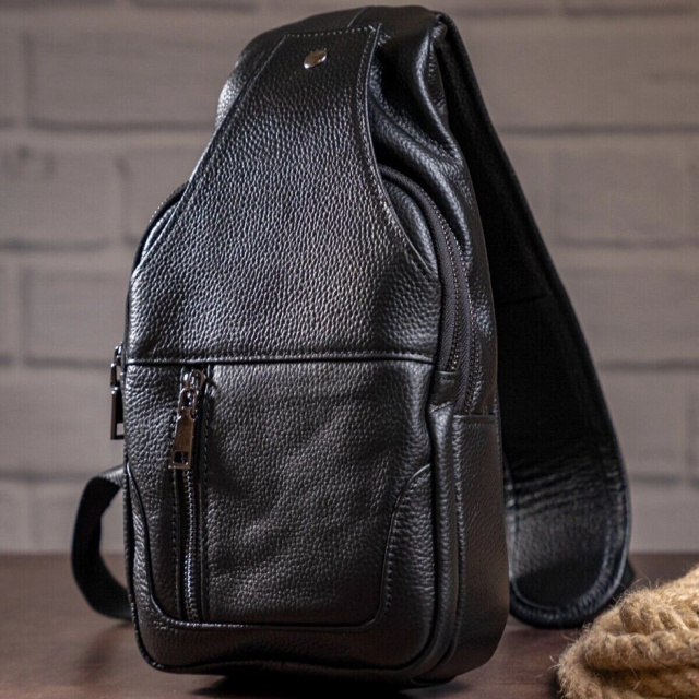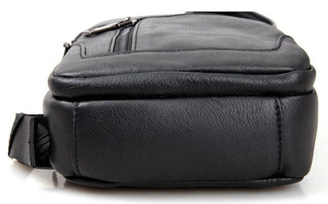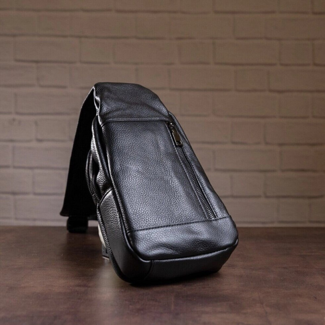 Зручна шкіряна сумка чорного кольору, яку можна носити як чоловікам, так і жінкам. Колір фурнітури: темне срібло. На лицевій і задній зовнішній стороні даної моделі знаходиться по одній кишені на блискавках. Аксесуар має два основних відділення на блискавках, які закриваються декоративним шкіряним хлястиком на магнітній кнопці. У другому основному відділенні знаходиться потаємне відділення на блискавці і невелика накладна кишеня.