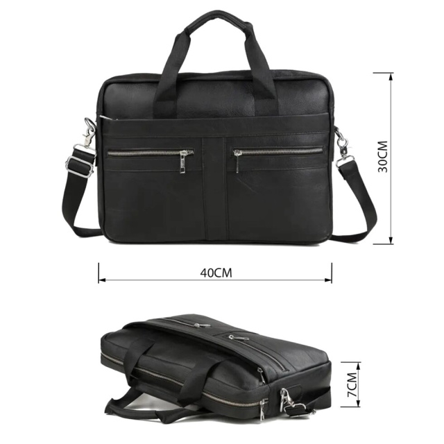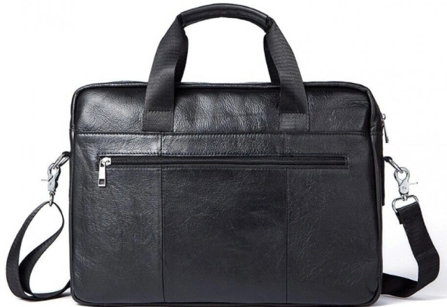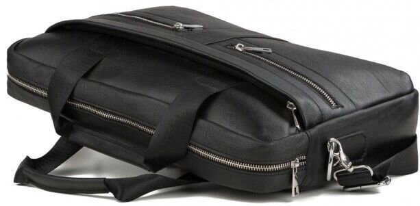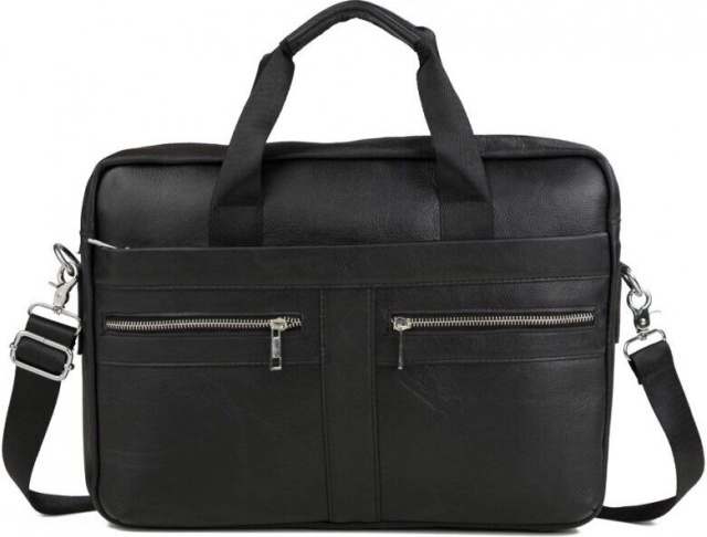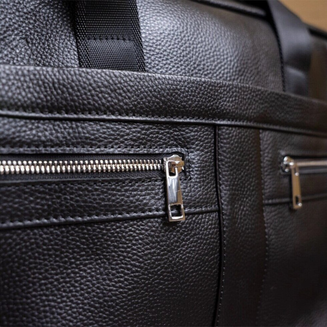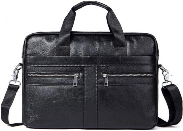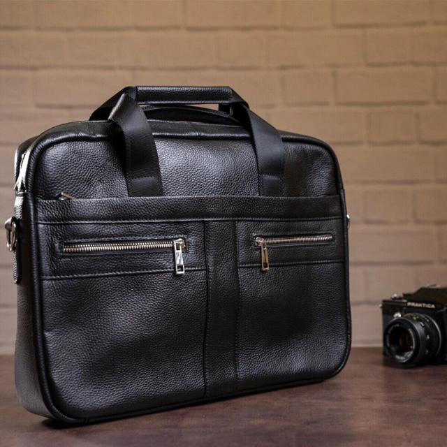 Вмістка чоловіча сумка з відділенням для невеликого ноутбука 15 дюймів, а також документів формату А4. Аксесуар виконаний з натуральної зернистої шкіри чорного кольору. На лицевій стороні даного виробу розташовані одне відділення і дві кишені на металевих блискавках. На задній зовнішній стороні знаходиться ще одне відділення на блискавці. Сумку можна переносити в руці за допомогою зручних шкіряних ручок, а також через плече (в комплекті є регульований плечовий ремінь, який виконаний з текстильного матеріалу). Колір фурнітури: срібло.