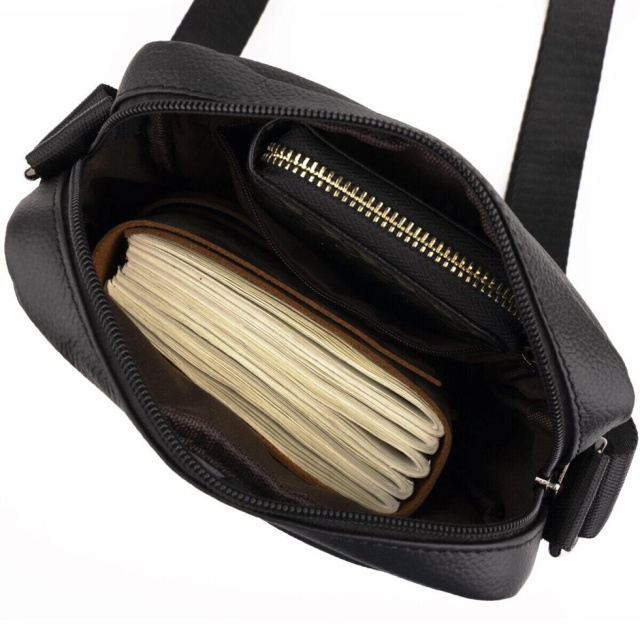 Компактна чоловіча сумка в класичному стилі з натуральної шкіри. Аксесуар прошитий чорною ниткою. Фурнітура сріблястого кольору. Зручна сумка на кожен день. Мінімальний функціонал і оптимальний розмір додають сумці популярності. Чи не вибаглива у використанні і комфортна в носінні. Усередині аксесуара текстильна підкладка коричневого кольору. Аксесуар упакований в тканинний чохол, що захищає його від забруднень і зносу. Буде чудовим подарунком для близької людини.