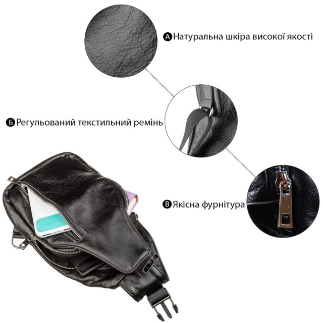 Вмістка і компактна сумка чорного кольору, може підійти як для чоловіків так і для жінок, з м'якої шкіри. Фурнітура кольору темного срібла з якісного металу. Із зовнішнього боку є невелика кишеня на блискавці. Сумка має одне відділення відкритого типу і одне глибоке відділення на блискавці. Усередині основного відділення є відділення для телефону. У модель можна вмістити все необхідне, гроші, сигарети, смартфон, паспорт. Оптимальний варіант на кожен день. Може бути відмінним подарунком. У нашому магазині величезний асортимент на будь-який смак і колір, а ціни вас приємно здивують.