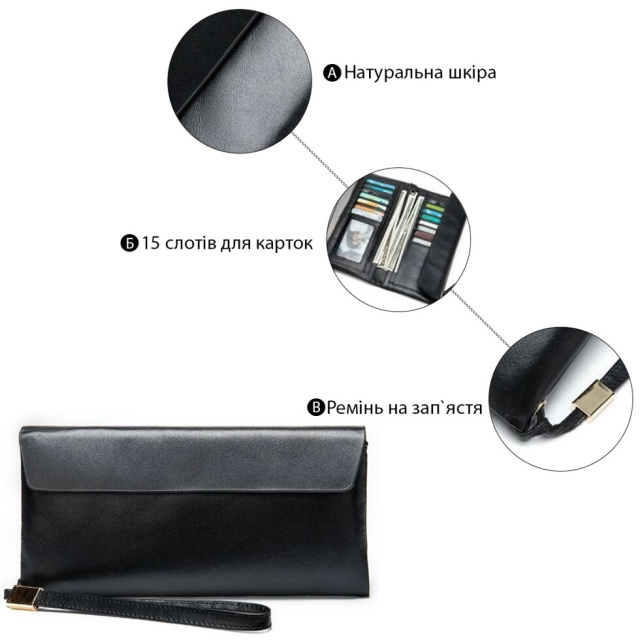 Універсальний місткий клатч з натуральної шкіри. М'який на дотик. Аксесуар доповнено золотистою фурнітурою. Всередині аксесуар з натуральної шкіри в поєднанні з міцним текстилем. Модель зручно сидить в руці і досить довго носиться. Аксесуар буде прекрасним подарунком для близької людини.