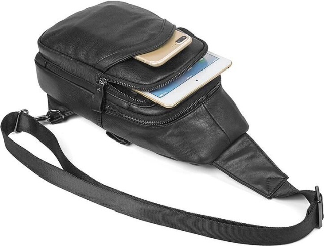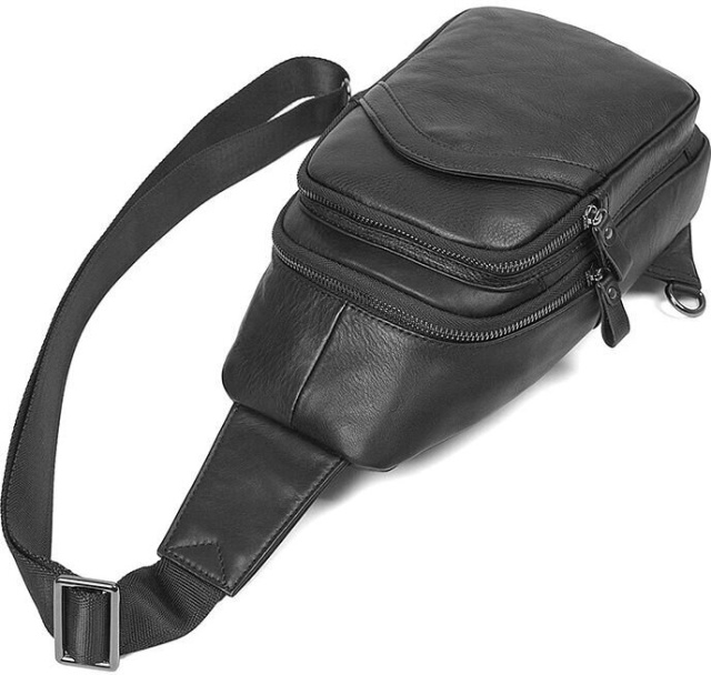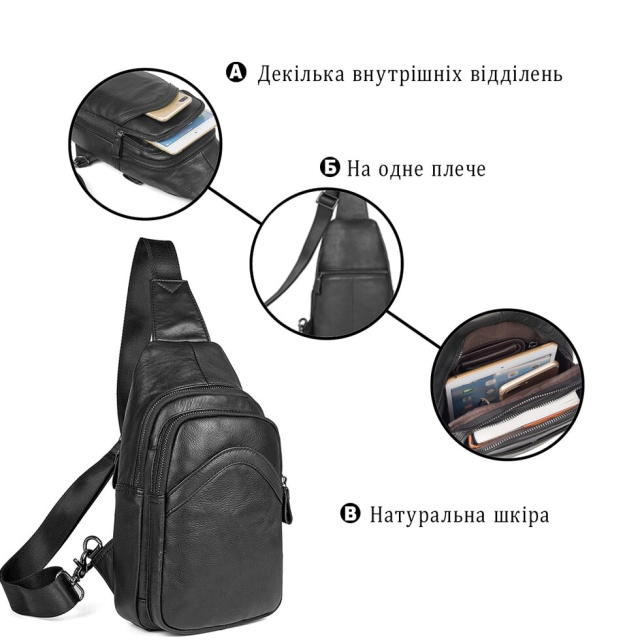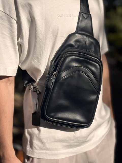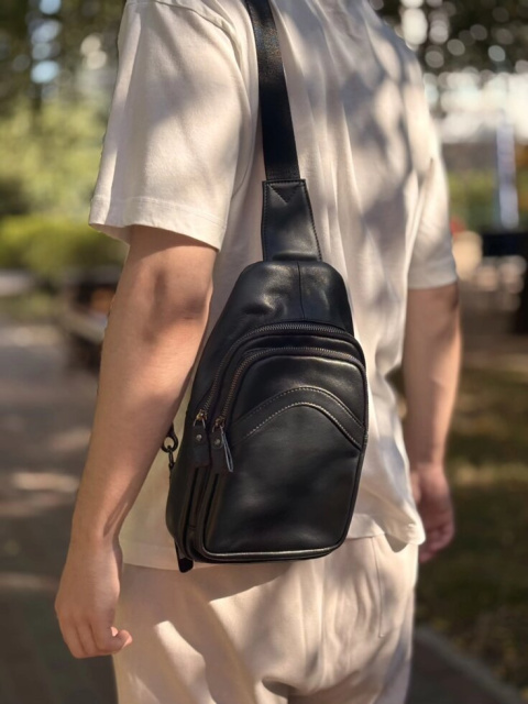 Стильна шкіряна сумка чорного кольору, дуже зручна і вмістка. Підійде як чоловікам так і жінкам. Колір фурнітури: темне срібло. Сумка має два основних відділення на металевих блискавках, одне з яких трохи більше і має потайну кишеньку на змійці. Також є дві зовнішні кишені, задня закривається на блискавку, а лецева на магнітну кнопку.