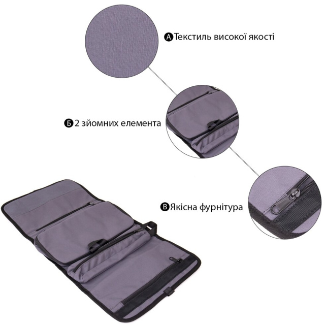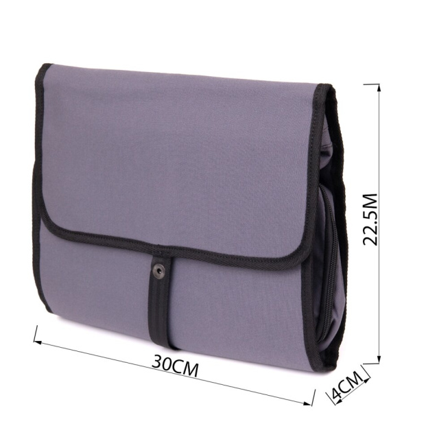 Компактний і функціональний органайзер. Виріб сірого кольору. Підійде в дорогу. Сумка стане знахідкою для мандрівників і практичних чоловіків і жінок. Аксесуар виконаний з якісних матеріалів і прослужить вам далеко не один рік. Органайзер стане найулюбленішим аксесуаром. Виріб буде хорошим подарунком для ваших близьких.