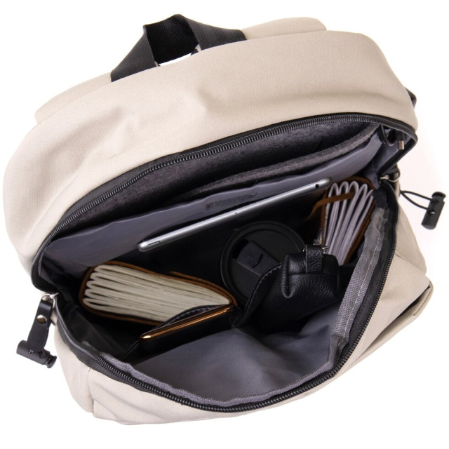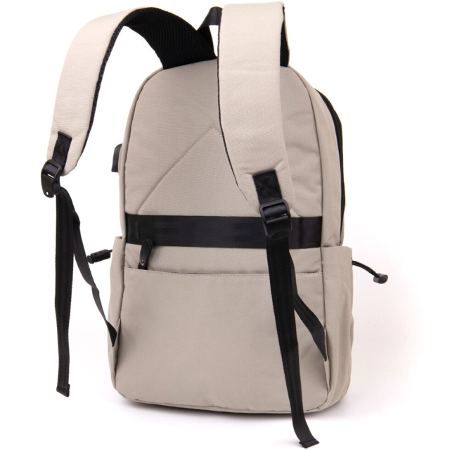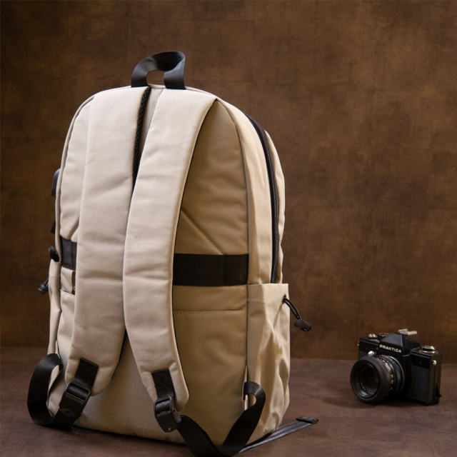 Легкий дорожній рюкзак під ноутбук з нейлону. Рюкзак в дуже практичному бежевому кольорі. Аксесуар має смарт функціонал. Роз'єм і шнур в комплекті для вашої зручності. Розміри рюкзака оптимальні для подорожей, а сам рюкзак не важкий. На тильній стороні петелька, яка дозволить вам зафіксувати каремат. З таким рюкзаком зручно відправитися в подорож або на відпочинок, або використовувати його в якості рюкзака під ноутбук. Виріб - відмінний варіант для занять спортом. Закривається рюкзак на блискавку і має одне основне відділення. Тканинний рюкзак стане хорошим подарунком для ваших близьких і найголовніше дуже корисним і необхідним.