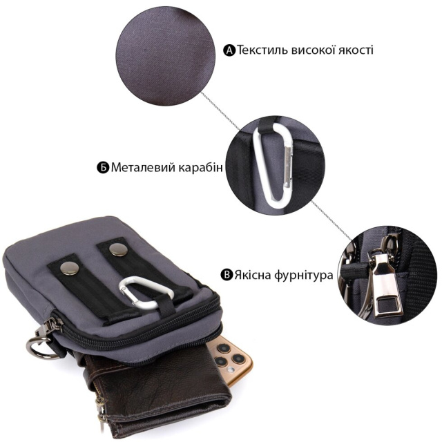 Маленька сумка на пояс, яка замінить вам барсетку. Сумка з нейлону дуже легка і практична. Виріб має необхідний функціонал. Сумку можна підчепити на лямки ременя за допомогою карабіна. Маленька текстильна сумка - ідеальний варіант на літо. Аксесуар доповнено якісною фурнітурою і має бюджетну вартість. Сумочка буде ідеальним подарунком для ваших близьких.