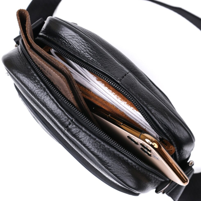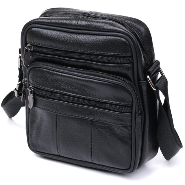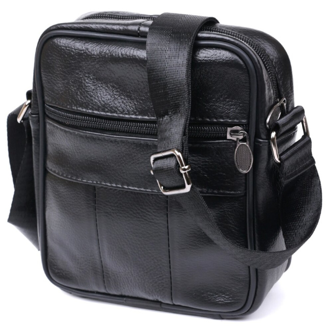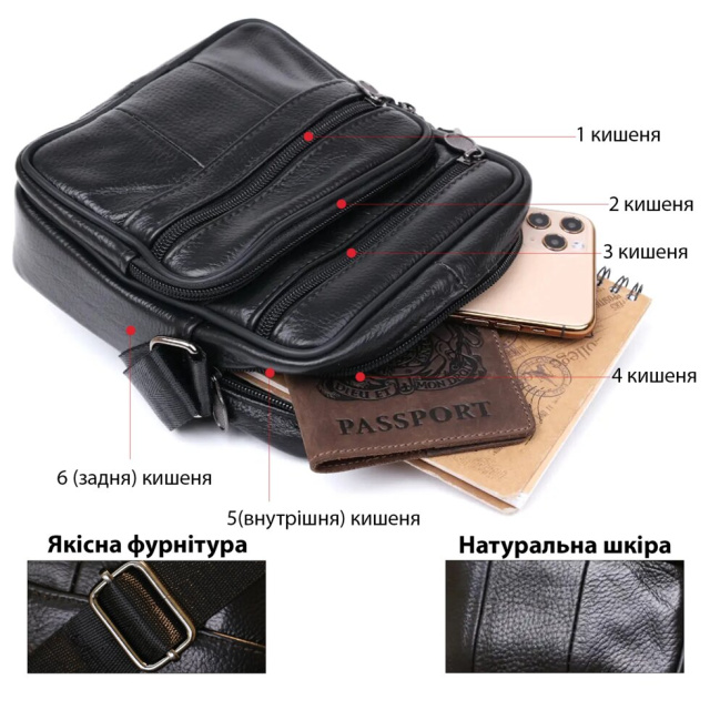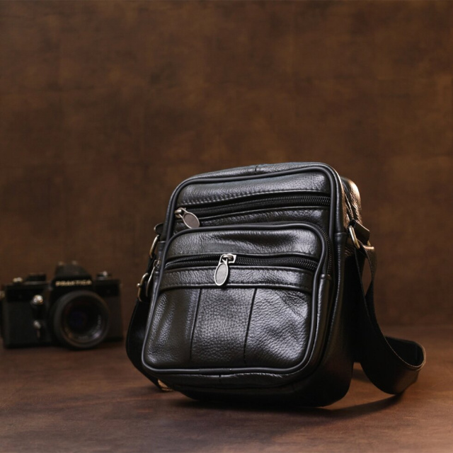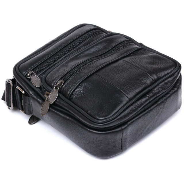 Відмінна компактна чоловіча сумка через плече з якісної шкіри з підвищеними показниками міцності та стійкості до зношування. У дизайні цієї моделі немає нічого зайвого, а це особливо важливо для цінителів лаконічності. Всі кишені закриваються на блискавки, ремінь зроблений із міцного текстилю.