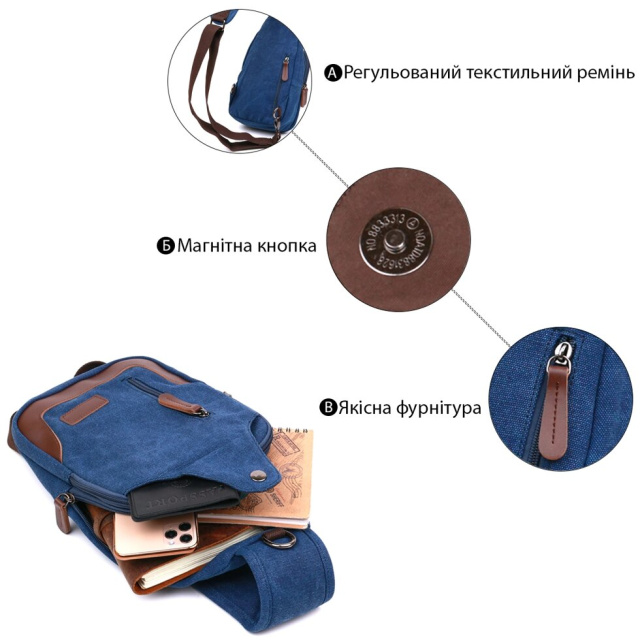 Практична та багатофункціональна чоловіча сумка через плече для повсякденного використання. Має простий та лаконічний дизайн. Колір виробу – темно-синій із коричневими шкіряними вставками. Ремінь зроблений також із високоміцного текстилю і може регулюватися по довжині, а також легко чіпляється на праву або ліву сторону за Вашими уподобаннями.
