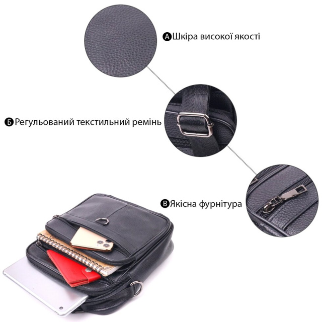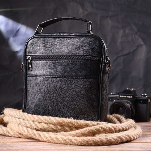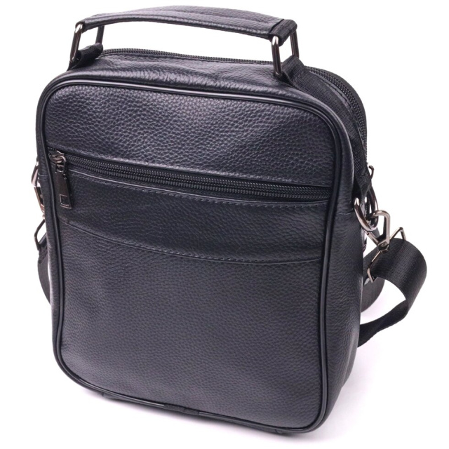 Сучасна чоловіча сумка середнього розміру із натуральної шкіри. Модель, яка ідеально підійде на кожен день. В аксесуарі одне основне відділення та п'ять кишень різних розмірів, сумку можна носити як у руці, так і на плечі. У сумку з легкістю помістяться всі необхідні речі. З таким аксесуаром усі Ваші речі будуть гаразд, з ним також буде зручно ходити на роботу чи зустрічі. Доповнено виріб якісною фурнітурою, темно-срібло кольору. Сумка стане чудовим подарунком для близької людини.